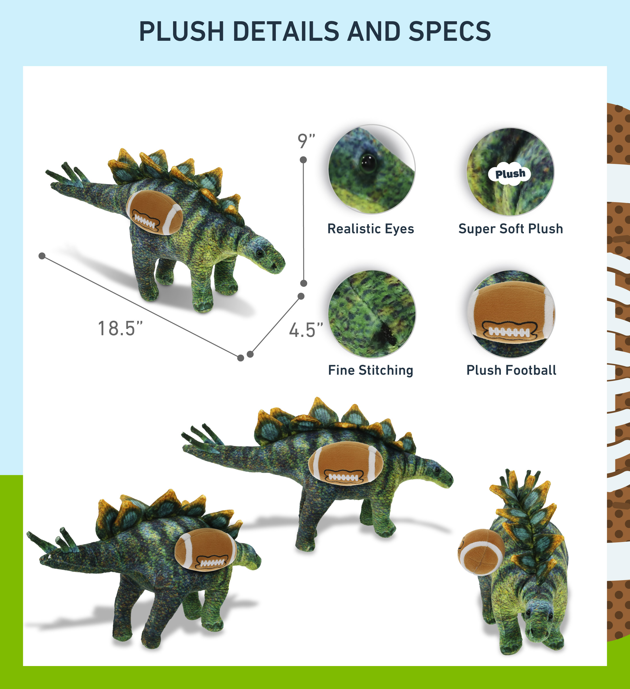 - Personalization, Customization, and Add-On Options – This Super Soft Sports Stuffed Animal Wild Collection Stegosaurus Dinosaur Plush comes customized with a football plush. You can personalize it with the name of your loved one imprinted on the item. You also have the option to add some or all of the cool add-ons to make your gift extra special: 1) Gift Bag; 2) Tissue Paper; 3) Greeting Card.