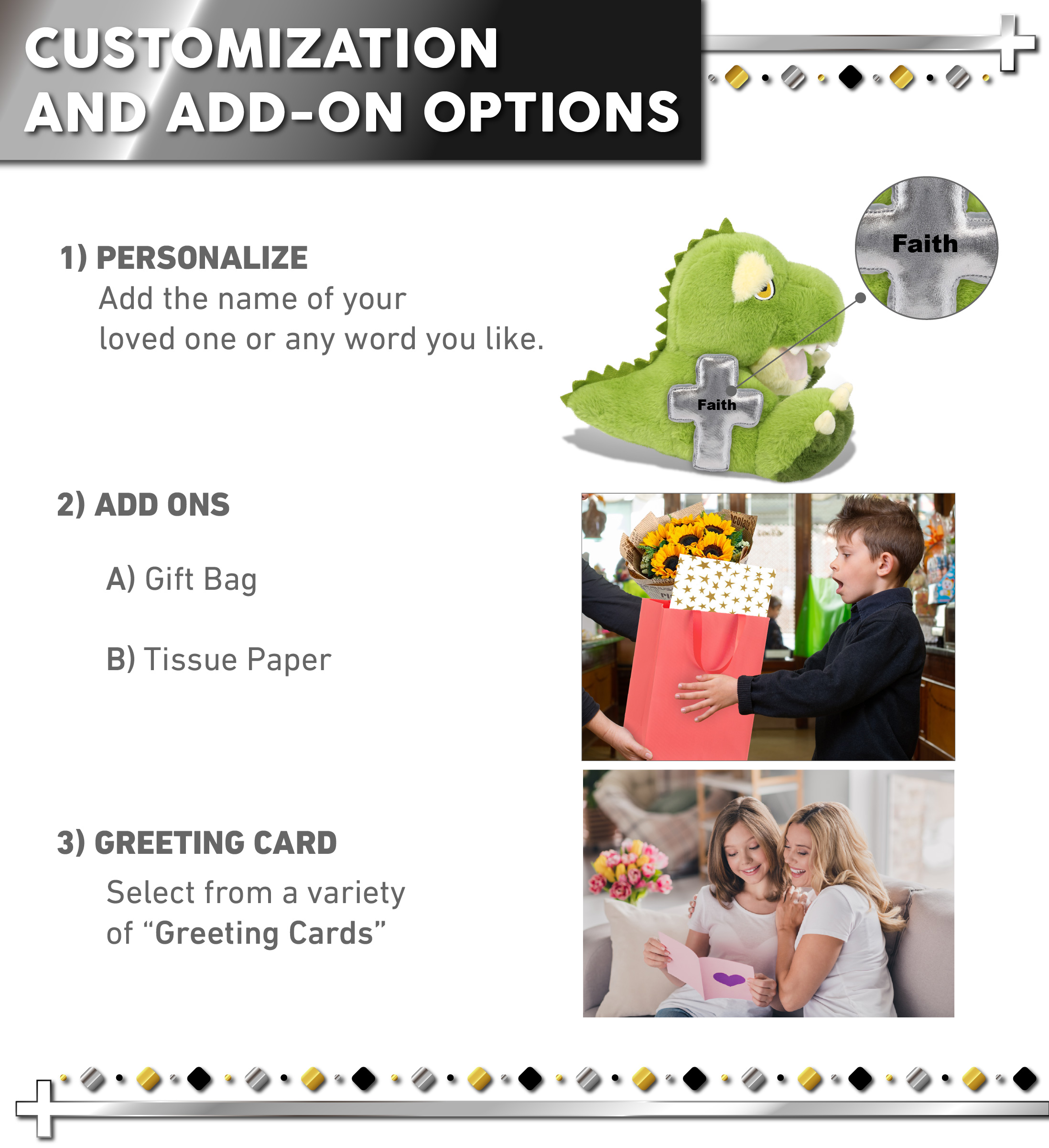 - Personalization, Customization, and Add-On Options – Super Soft Eco-Friendly T-Rex Dinosaur stuffed animal bear comes customized with a shiny metallic cross. You can turn it into a personalized teddy bear with the name of a loved one, or add any word which we will imprint on the item. And last, you have the option to add some or all of the cool add-ons to make your gift extra special: 1) Gift Bag 2) Tissue Paper 3) Greeting Card.