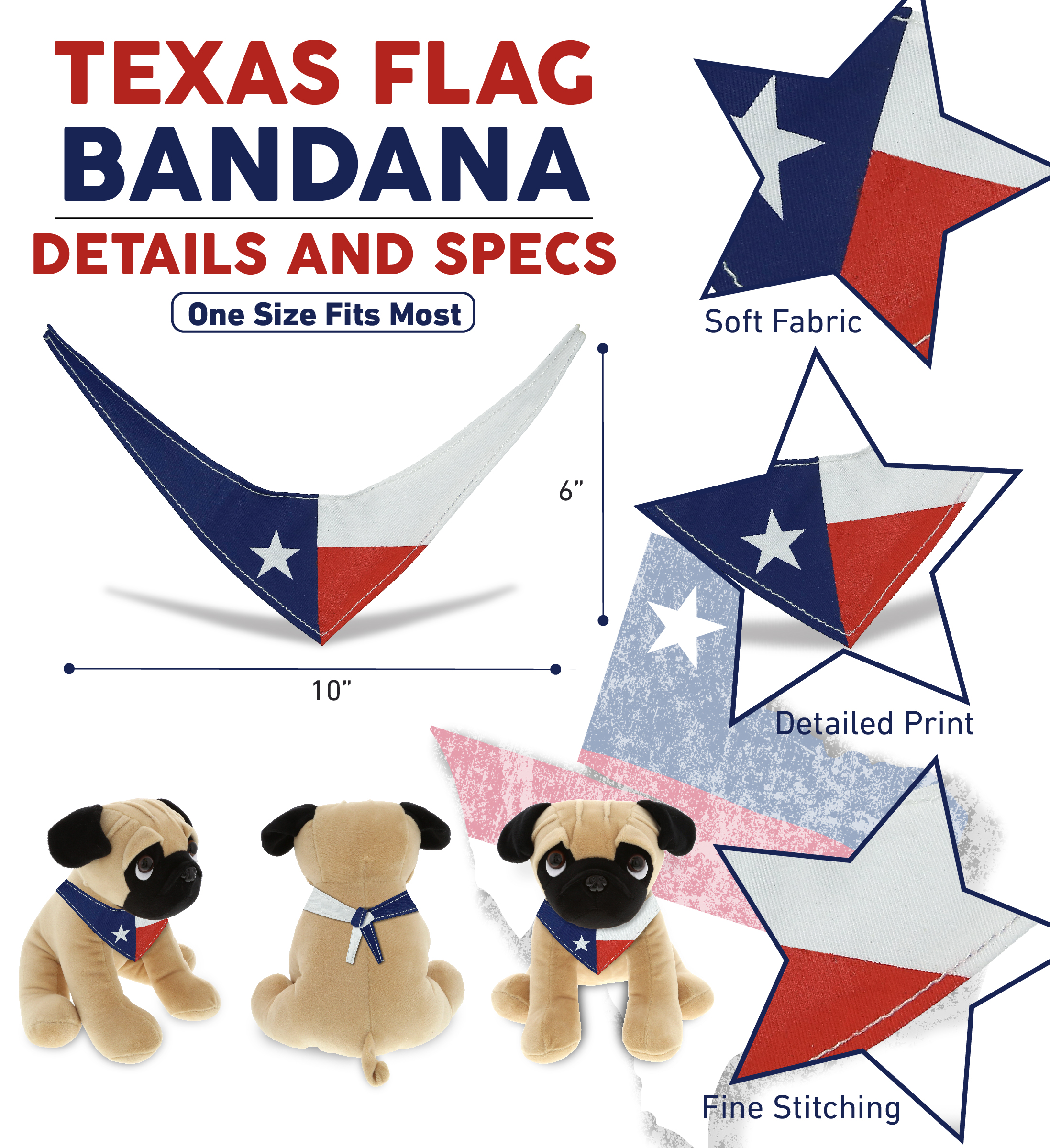 - INCLUDED WITH THE PURCHASE OF THE TEXAS FLAG BANDANA – Includes 1 DolliBu Texas Flag Bandana for stuffed animals. The blue, white, and red star bandana for Stuff Bear makes a great representation of Texas pride and adds personality to your plush toys. Perfect for styling your stuffed animal clothes or as Texas gifts to collectors of clothes for teddy bears. This bandana scarf measures 10L X 6W inches and fits most plush toy sizes.