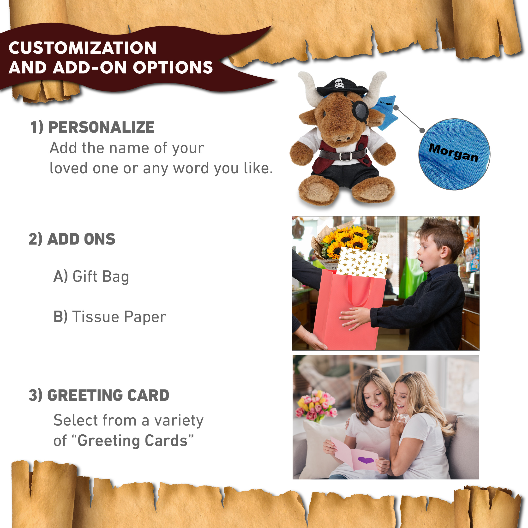 - Personalization, Customization, and Add-On Options – The longhorn figure stuffed toy comes dressed in full pirate clothes, complete with pirate hat, pirate vest, pirate shirt, pants, belt, and pirate mask. Make your bear doll special by adding a personalized name, which we will imprint onto the plush. You can also customize your stuffed animal by adding any of our add-ons to create the perfect gift: 1) Gift Bag 2) Tissue Paper 3) Greeting Card.