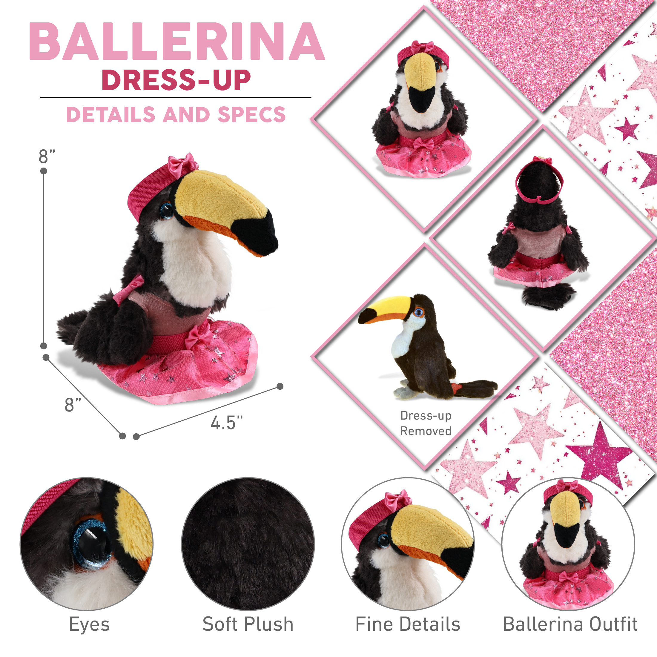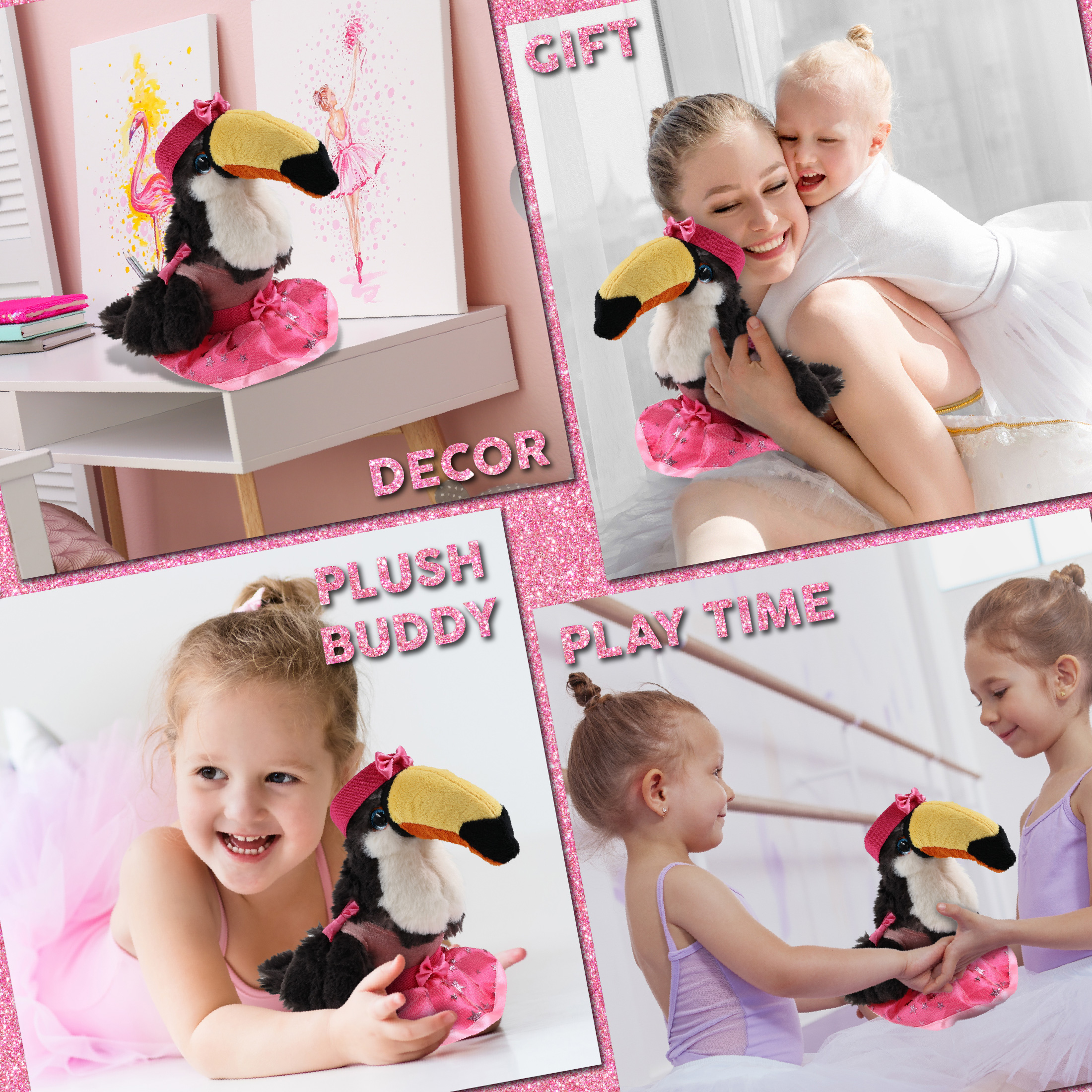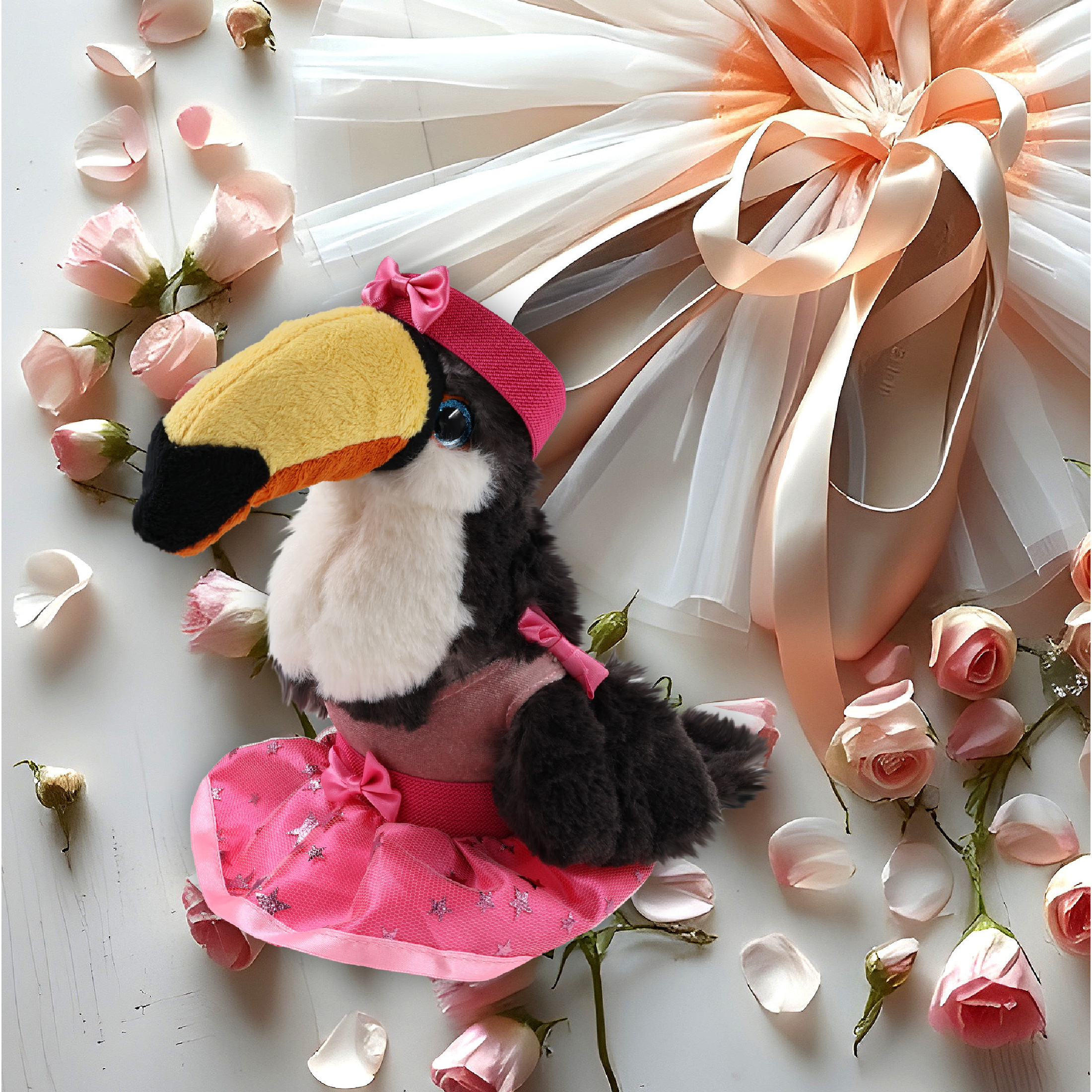 - Ballerina-Themed Stuffed Animal toucan Doll Features a Unique Combination of Animals and Ballet – It features a cute toucan plush with adorable pink ballerina clothes. The stuffed animal toucan plush toy features a soft plush all over and a set of pink ballerina dress complete with a pink ribbon headband, tutu skirt, and a sleeveless top, making it a cute ballerina stuffy doll little dancers will enjoy to play and collect.