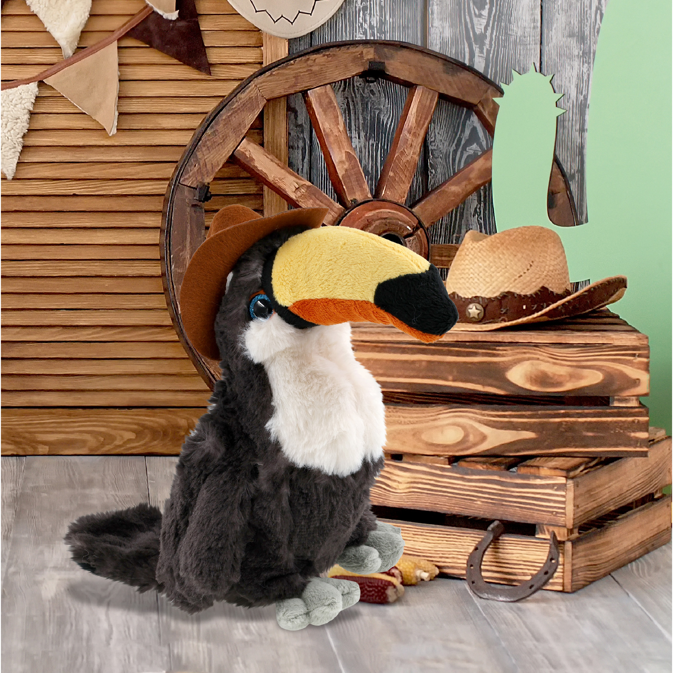 - Toucan with Western Hat Features Realistic Details from its Cowboy Hat – With its doll cowboy hat, this toucan figure rocks a look that’s both fun and stylish. The combo of toucan toy and cowboy hat accessory creates two playful themes, wildlife and the Wild West. The plush toucan with cowboy bear hat makes the perfect addition to your collection of plush toys and cool stuffed animal clothing.