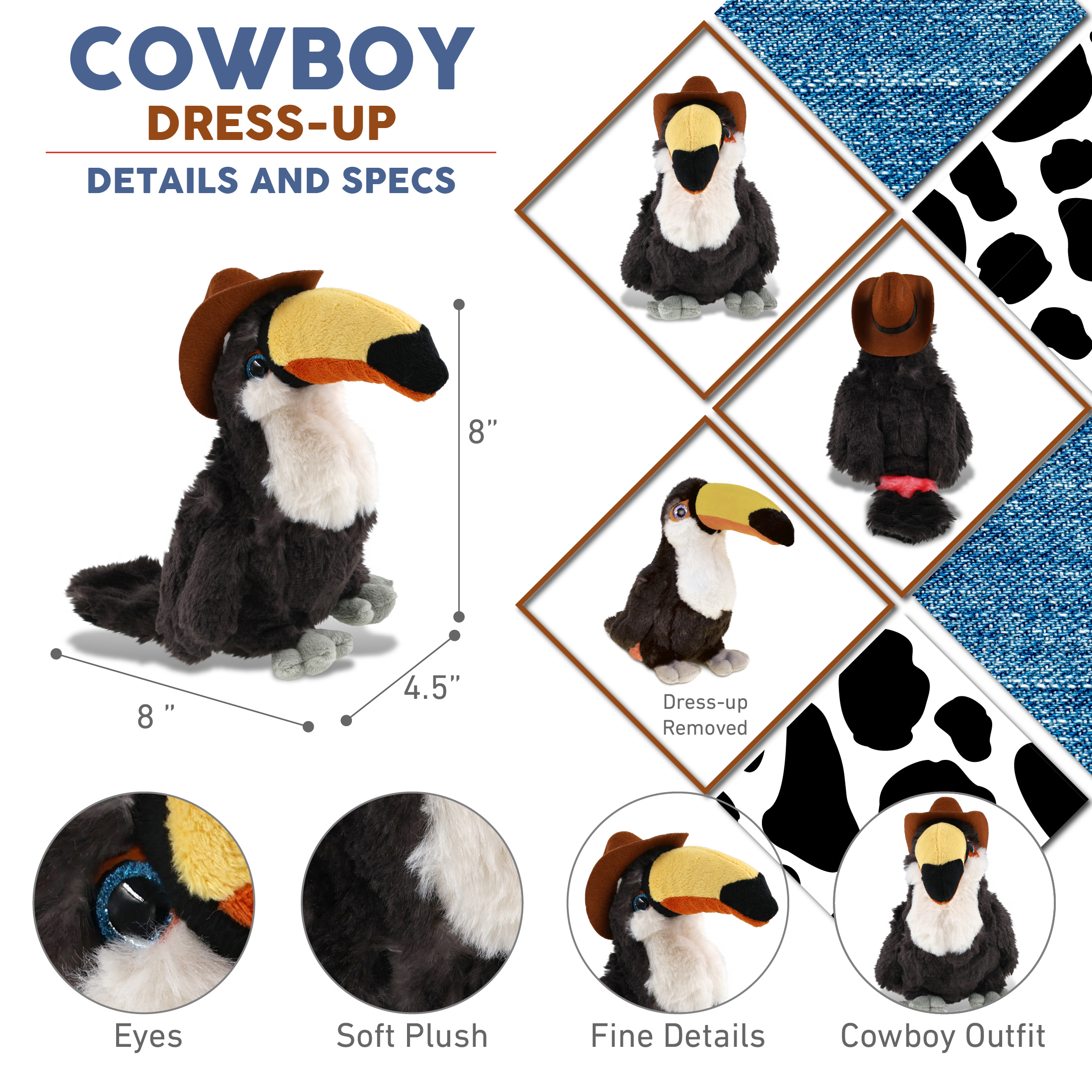 - Includes 1 DolliBu Toucan Toy with Cowboy Dress Up Hat – This toucan plush arrives with western cowboy plush hat. The cute stuffed toy features a brown cowboy costume hat. Whether you collect adorable stuffed animals or gifts for cowboys with cowboy stuffed animal clothes and accessories, this teddy bear plush toy is the perfect cowboy gift. It measures 8Lx4.5Wx8H inches and is best for kids ages 3 and up.