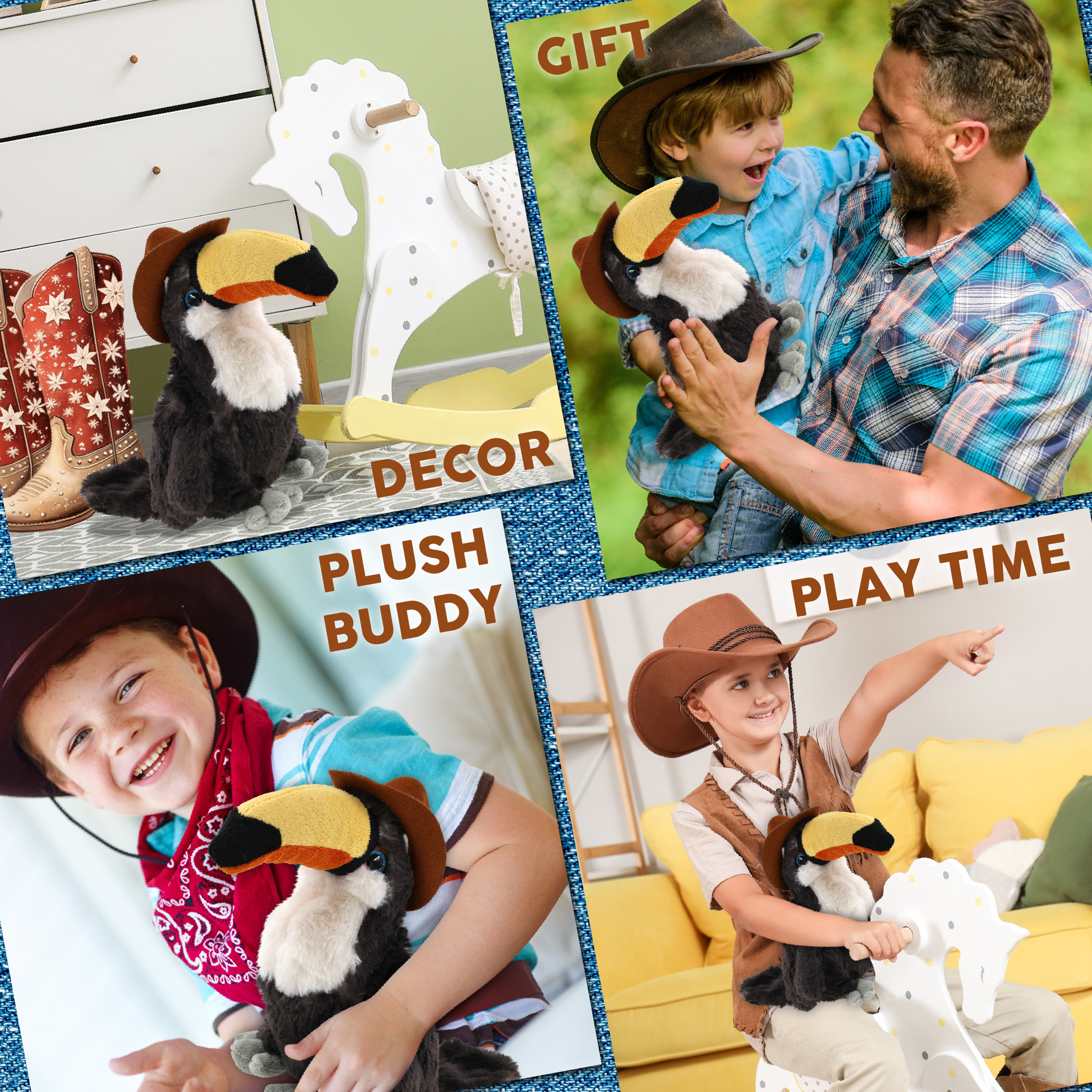 - Made of High-Quality Polyester – The cowboy plush doll hat and the plush toy toucan are crafted with super soft, durable, premium-quality polyester materials. This cute plush is built to last through animal cowboy showdown. The cowboy stuff hat can be easily put on any stuffed animal doll. Perfectly built to withstand everyday cuddles.