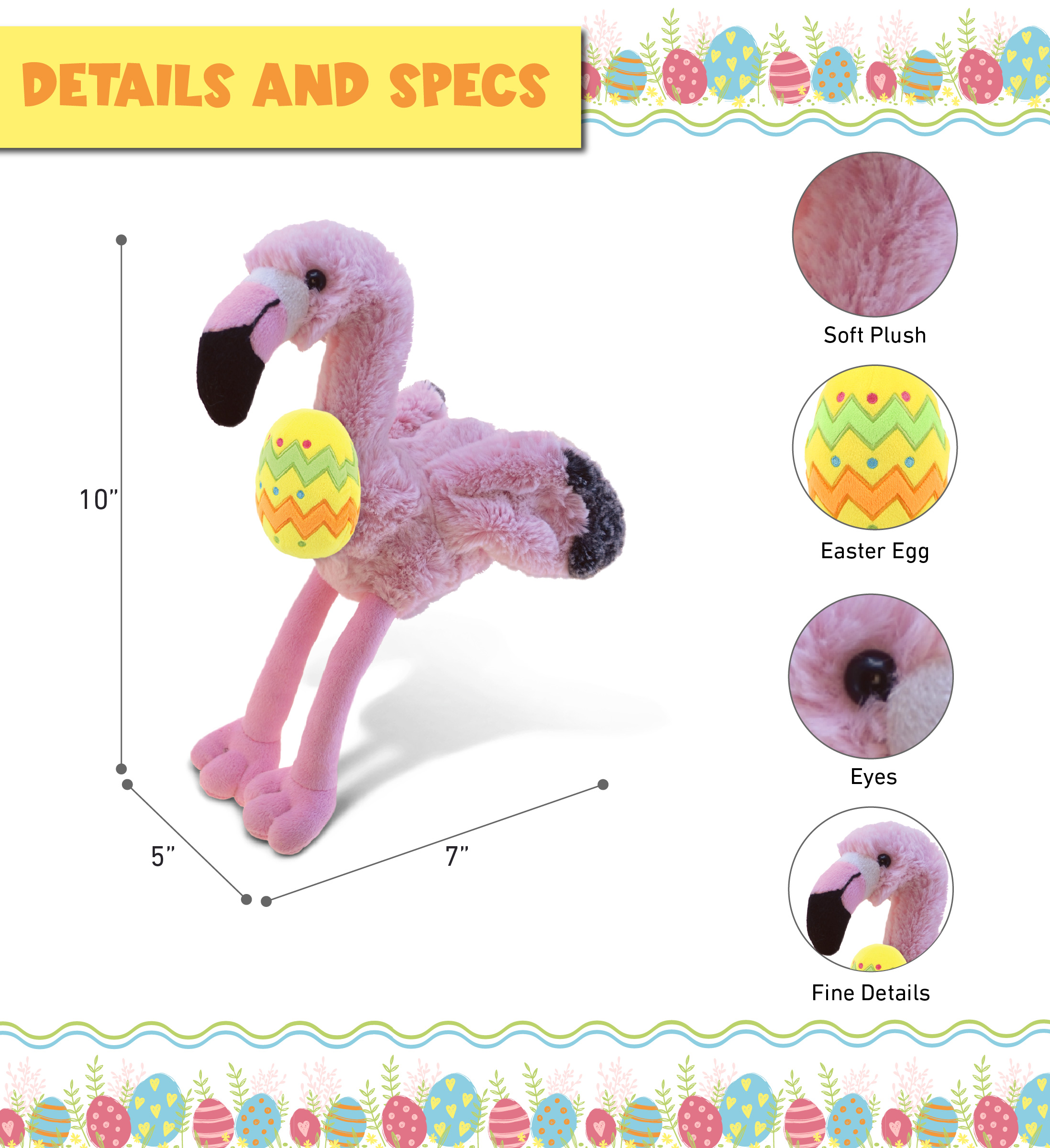 - HIGH-QUALITY EASTER PLUSH FOR GIRLS AND BOYS – Super Soft flamingo is a stuffed animal Easter plush made of premium 100% polyester. The flamingo is covered with pink plush, the Easter egg is yellow featuring zig zags and dots in spring color. Cute stuffed animals for girls and boys crafted with durable materials designed to deliver a Welcome Spring and Easter message. To maintain the flamingo plush, wash with cold water and allow to air dry.