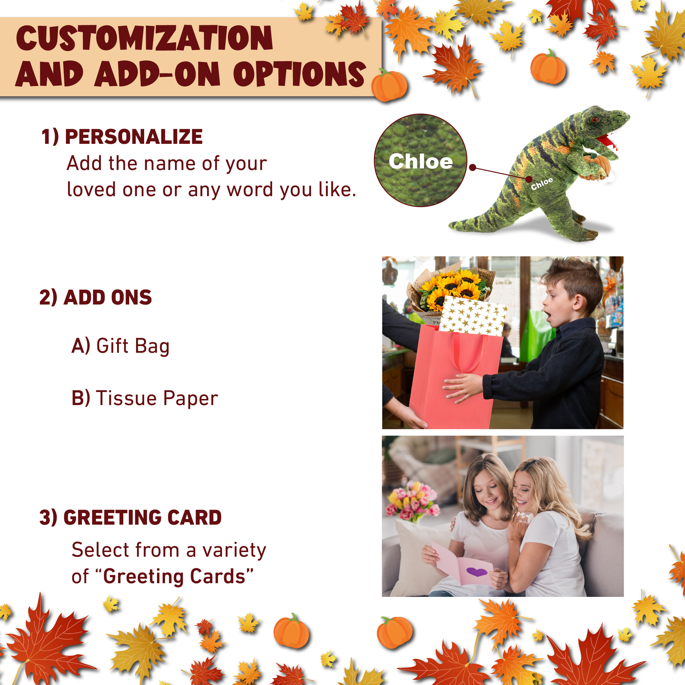 - Personalization, Customization, and Add-On Options – The Wild Collection Tyrannosaurus Rex Dinosaur Halloween stuffed animal comes customized with a small pumpkin plush toy. You can personalize your dino plush with the name of a loved one or add any word that we will imprint on the item. You also have the option to add some or all of the cool add-ons to make your gift extra special: 1) Gift Bag 2) Tissue Paper 3) Greeting Card.