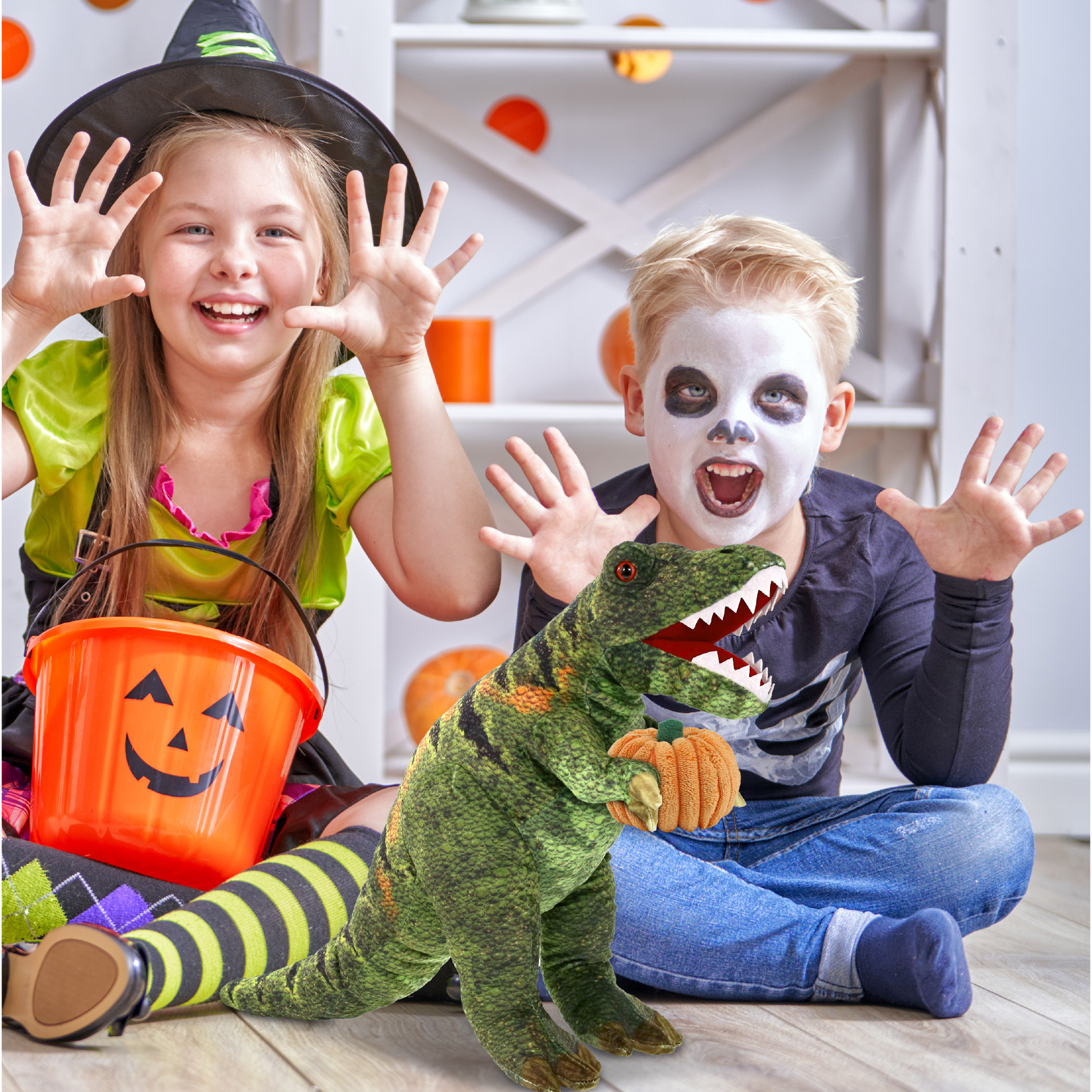 - High-Quality Fall Gift for Kids and Adults – The Tyrannosaurus Rex Dinosaur stuffed animals for cuddling is a cute soft stuffed animal covered in fluffy plush made of premium quality 100% polyester. Snuggly soft pumpkin decor Halloween toys crafted with durable materials designed to deliver a loving message to your friends and family. Maintain the plush, wash it with water, and allow to dry. Add to a Halloween basket for baby, kids or adults.