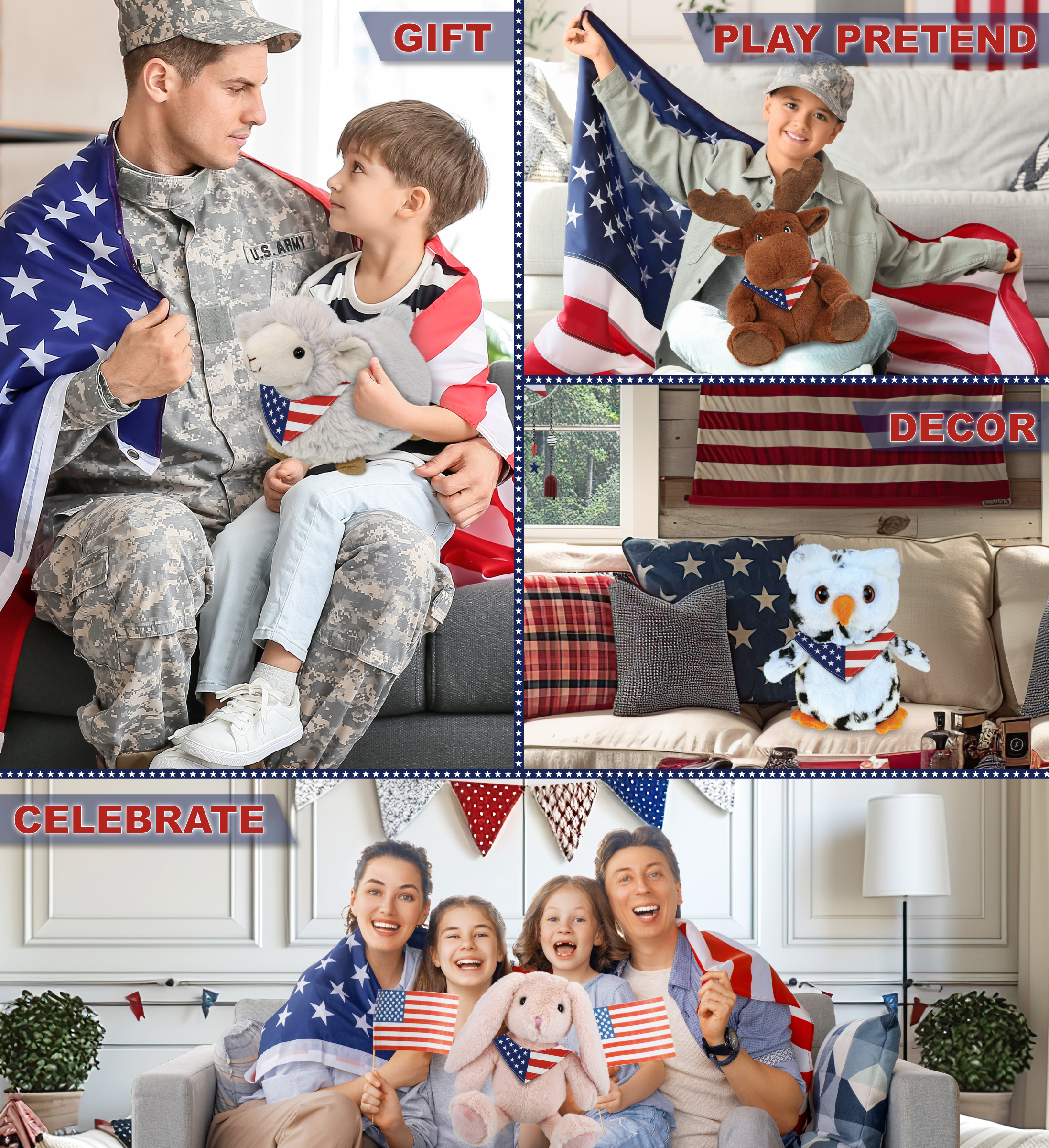 - IDEAL USE FOR THE FLAG OF USA SCARF STUFFED ANIMAL CLOTHING ACCESSORY – Cute teddy bear accessories like this USA flag bandana are perfect for decorating plush toys and showcasing your love for your country. Whether you’re accessorizing your favorite plush doll for display or adding a unique touch to your cowboy stuffed animal, this USA flag-inspired stuffed animal bandana brings the American spirit to your collection of teddy bear outfits.