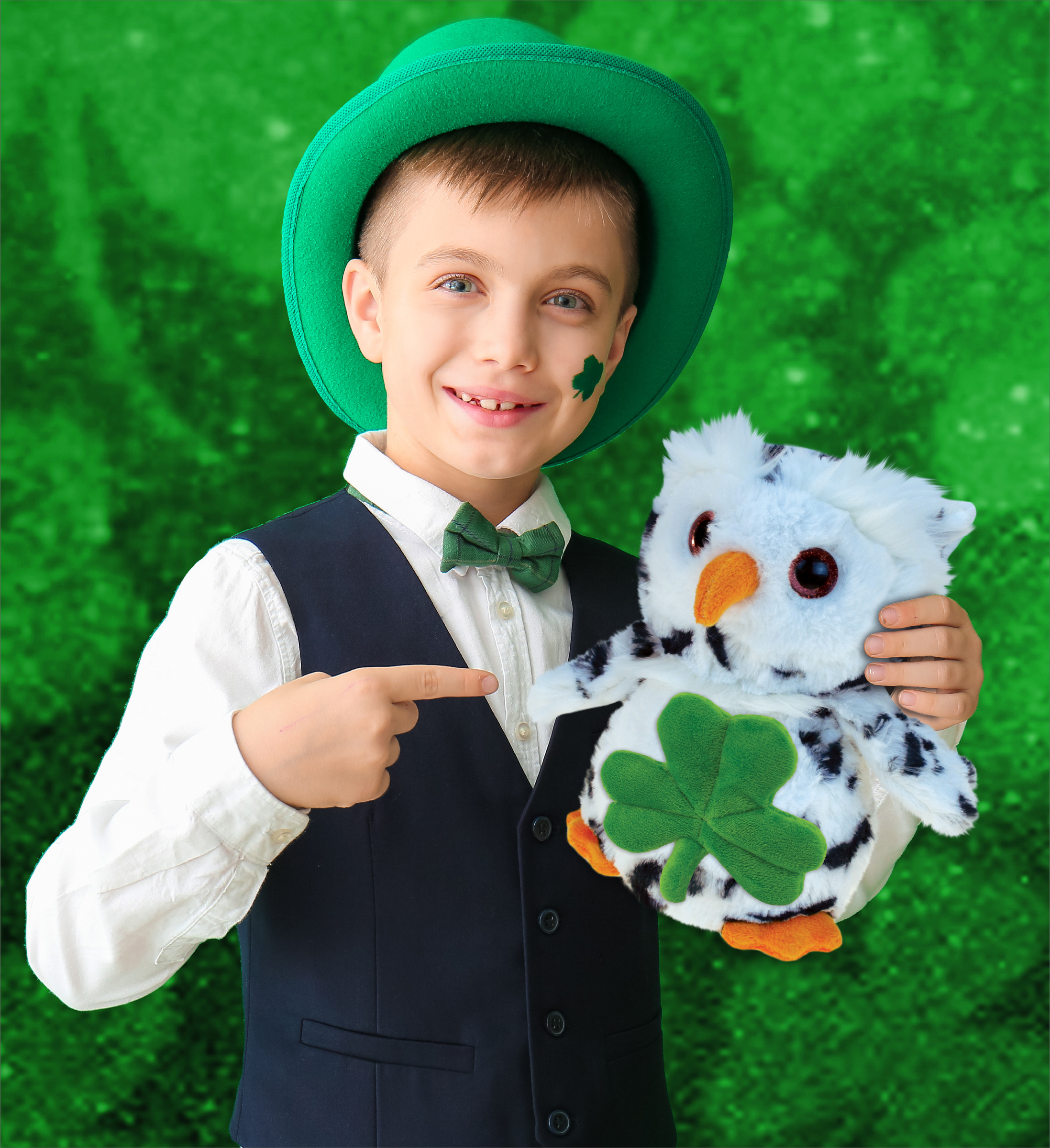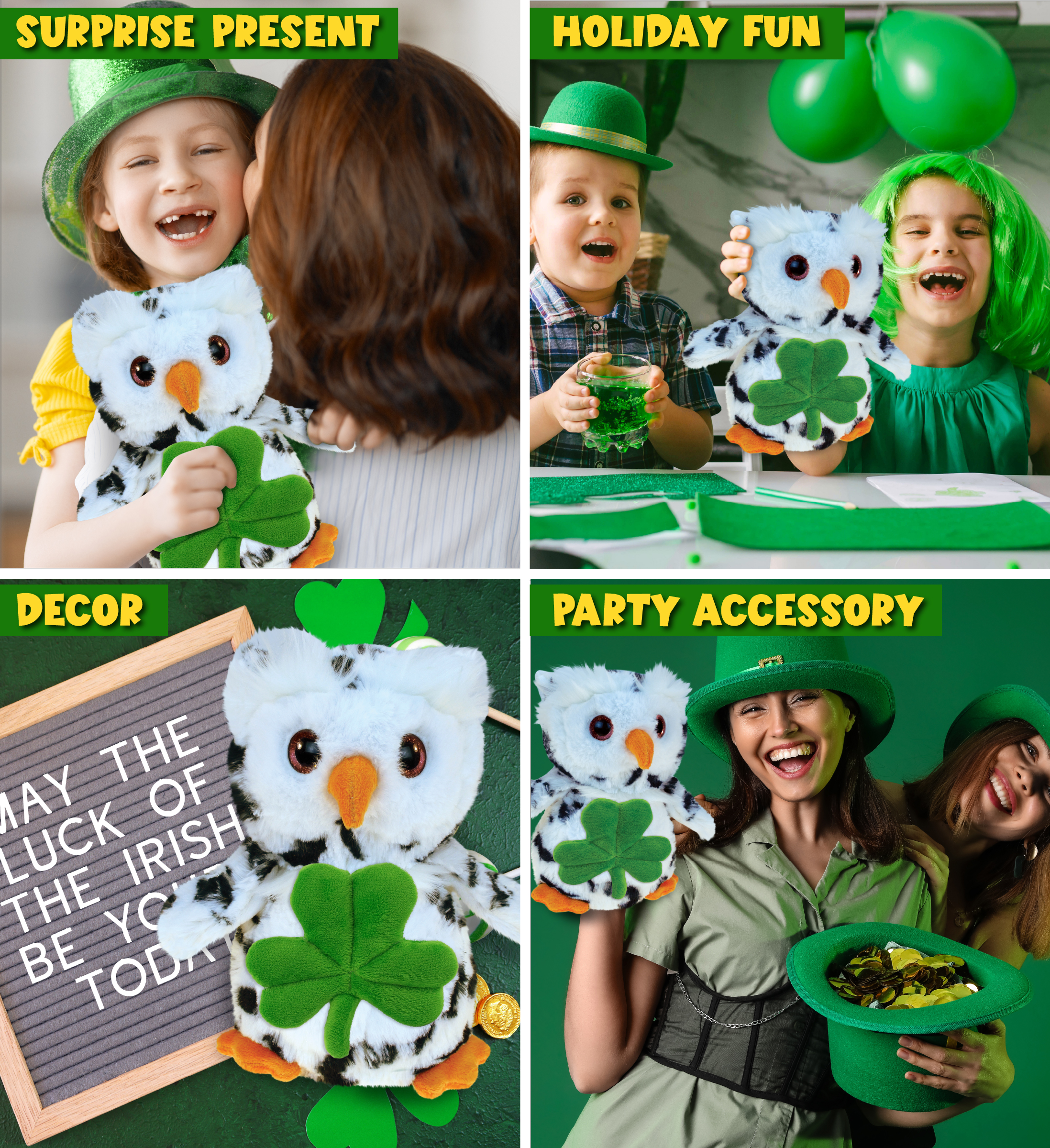 - THE SHAMROCK PLUSH OWL BIRD IS FOR EVERYONE WHO LOVES STUFFED ANIMALS – The soft plush stuffed animal white owl toy with an Irish shamrock is for everyone looking for cute stuffed animals to celebrate St Patricks Day. Perfect for Saint Patricks Day decor or cool prizes on St Patricks Day Games. Let the good and fun times roll with this owl bird with a green plush shamrock; cute green St Patricks Day Gift to give this festive season.