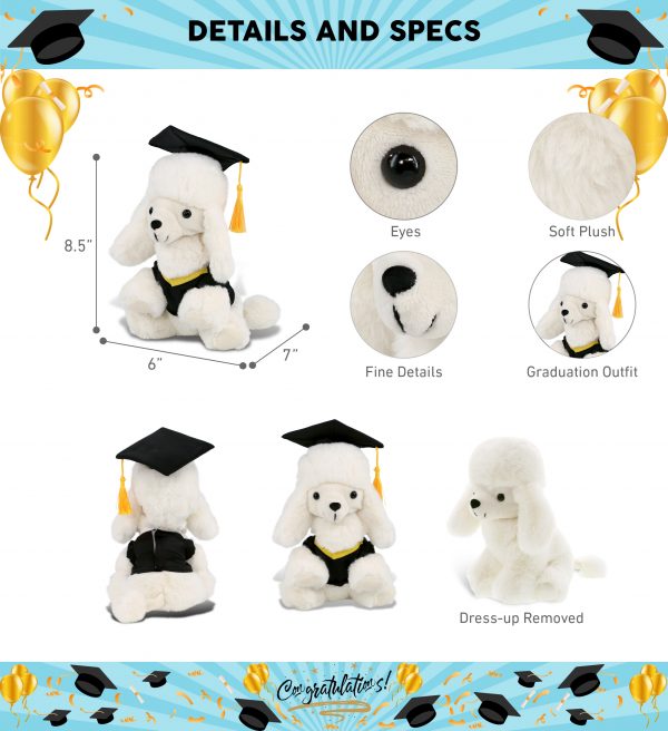 - INCLUDED WITH THE PURCHASE – Includes 1 Super Soft White Poodle Dog Plush Toy in a graduation gown. The adorable dog plush animal is wearing a removable black toga and graduation cap with a yellow tassel. Decorated with realistic designs and fluffy plush that makes the graduation custom poodle perfect for cuddles and snuggles. This cute dog graduation stuffed toy measures about 7Lx6Wx8.5H inches.