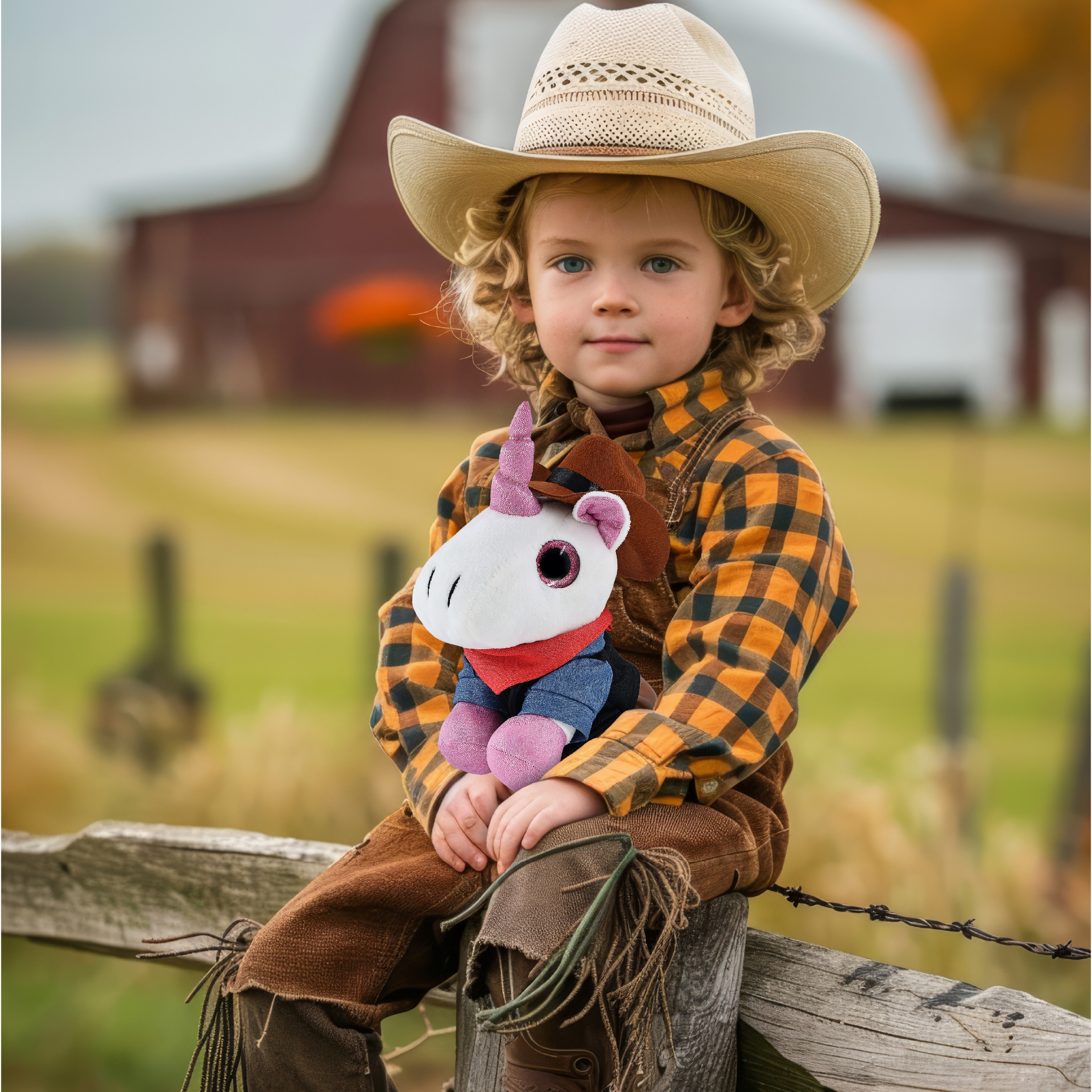 - White Unicorn with Western Outfit Features Realistic Details from its Cowboy Hat to Leather Chaps – From its doll cowboy hat to detailed outfit, this unicorn figure rocks a look that’s both fun and stylish. The combo of unicorn toy and cowboy accessories creates two playful themes, fantasy and the Wild West. The plush unicorn with cowboy bear outfit makes the perfect addition to your collection of plush toys and cool stuffed animal clothing.