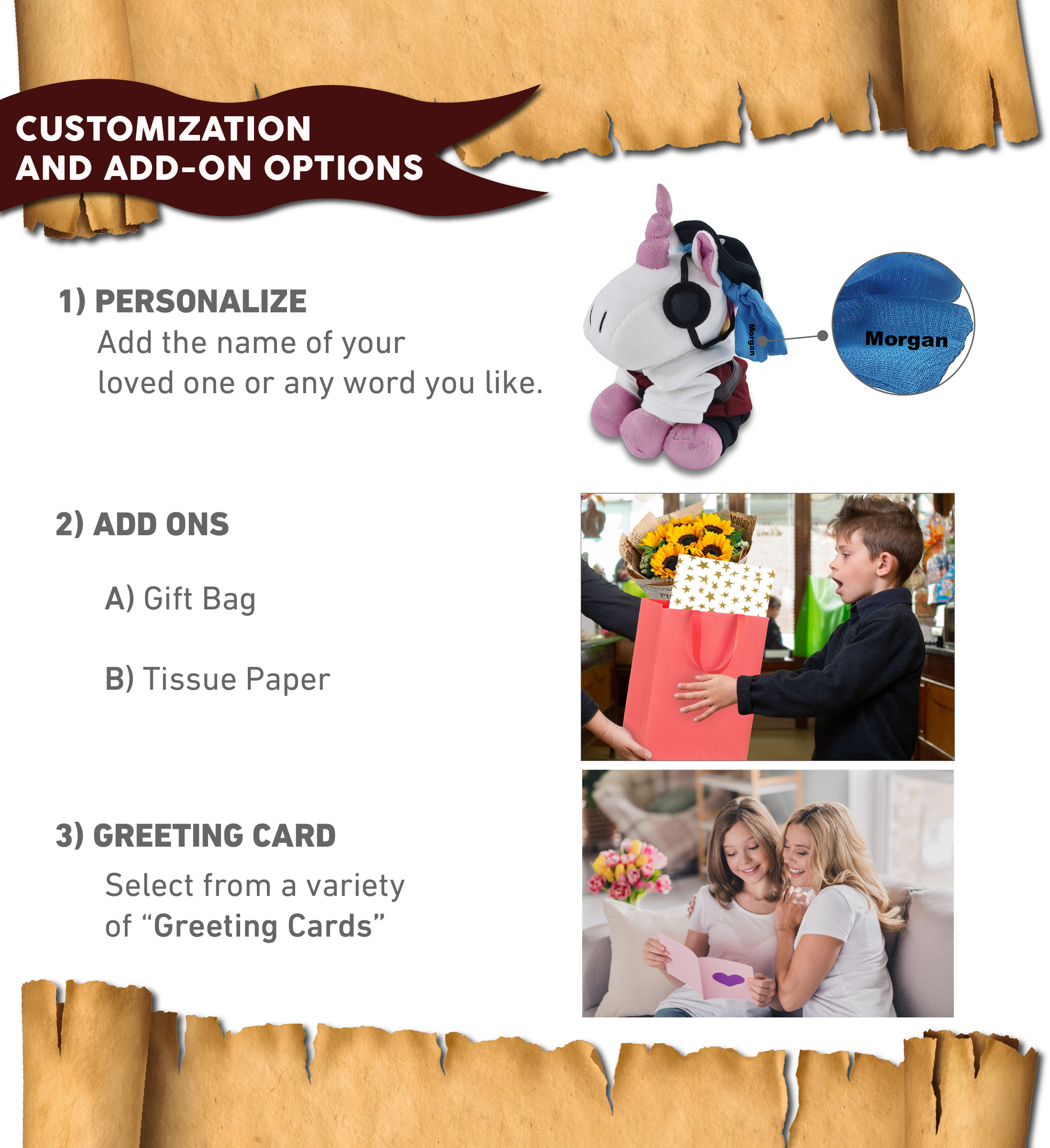 - Personalization, Customization, and Add-On Options – The unicorn figure stuffed toy comes dressed in full pirate clothes, complete with pirate hat, pirate vest, shirt, pants, belt, and pirate mask. Make your plush unicorn special by adding a personalized name, which we will imprint onto the plush. You can also customize your stuffed animal doll by adding any of our add-ons to create the perfect gift: 1) Gift Bag 2) Tissue Paper 3) Greeting Card.