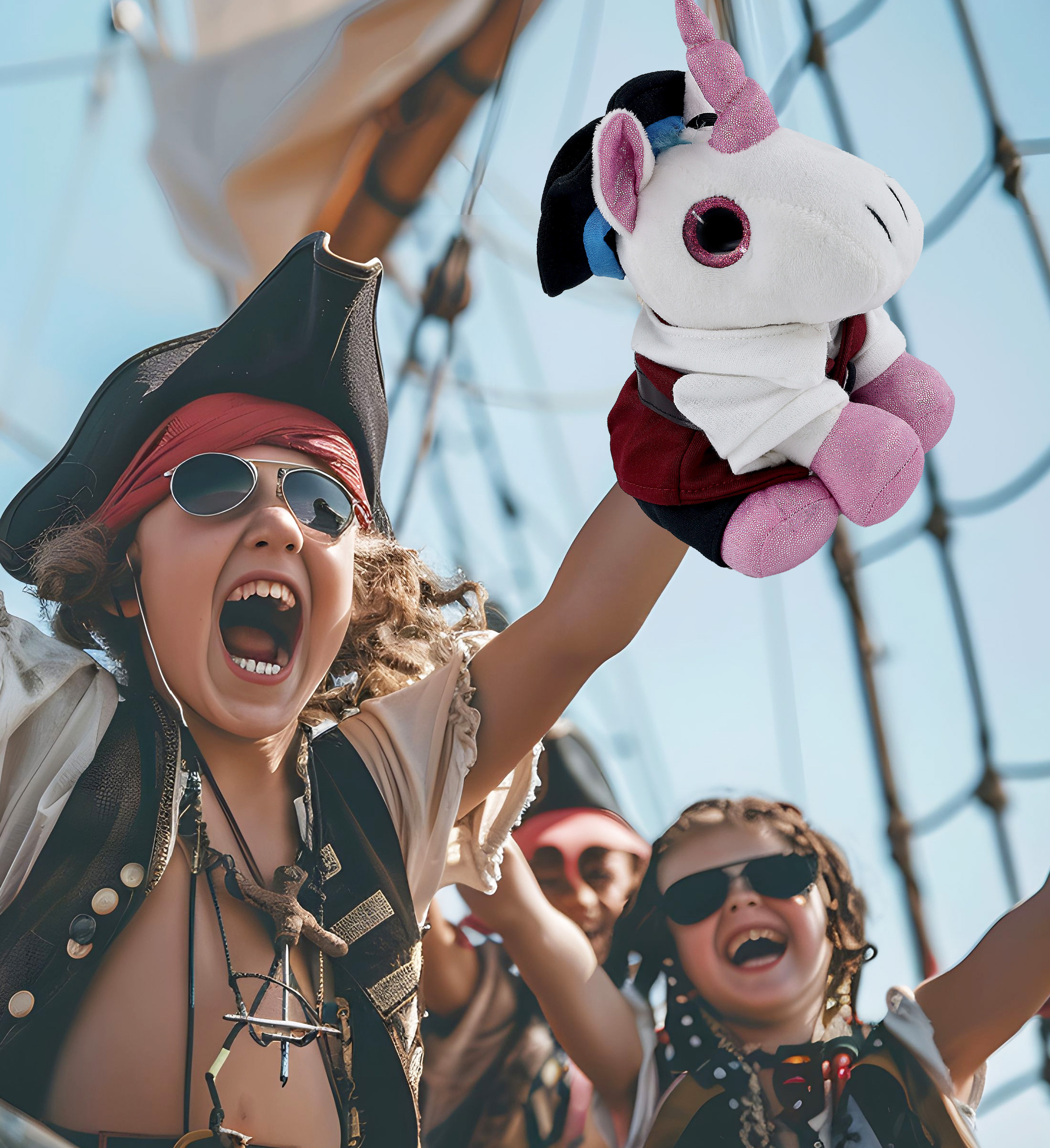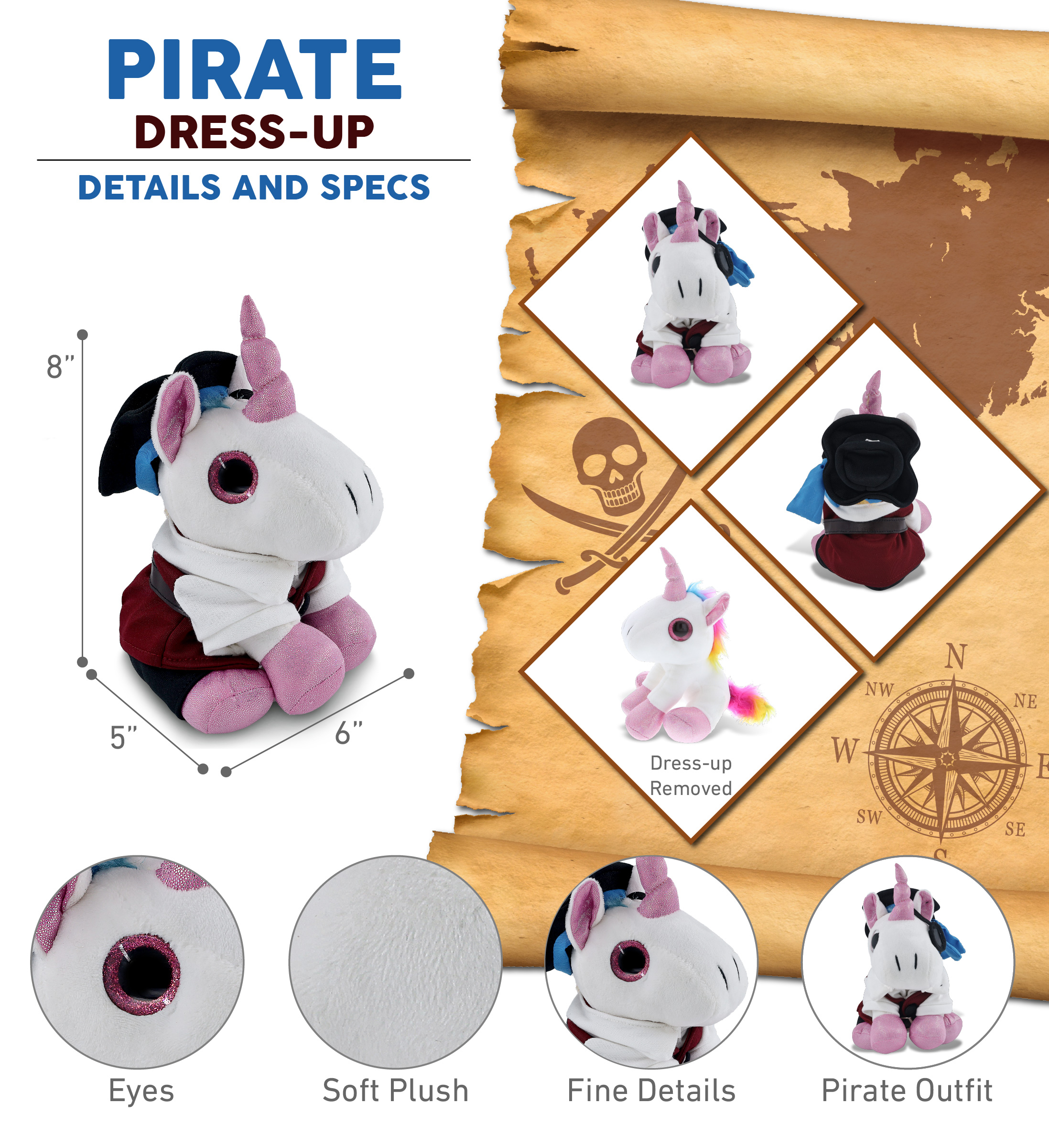 - Includes 1 DolliBu Plush Unicorn Toy with Pirate Outfit -The stuffed animal unicorn doll wears a pirate costume featuring a pirate vest, belt, shirt, pants, and pirate hat. Whether you’re collecting unicorn toys or hunting for pirate stuff for kids, this toy unicorn is the perfect combo of silly plush fun and dress-up adventure. This cute stuffed animal pirate plush unicorn measures approximately 5Lx6Wx8H inches. Best for kids ages 3 and up.