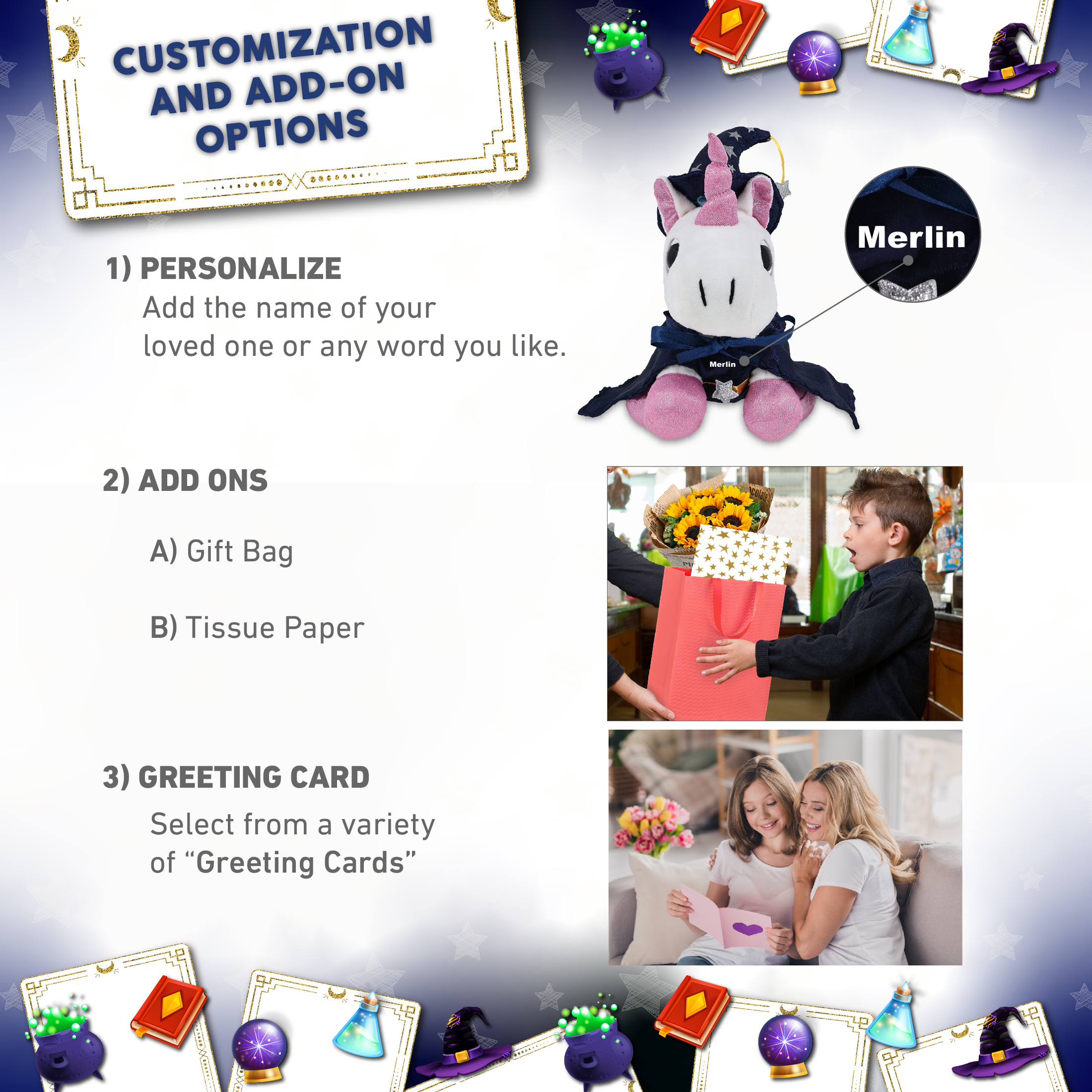 • Personalization, Customization, and Add-On Options – The unicorn stuffed animal comes dressed in a complete wizard outfit, with a wizard cloak and hat with silver star details. Make your wizard stuffed unicorn special by adding a personalized name, which we will imprint onto the plush. You can customize your plush wizard toy by adding any of our add-ons to create the perfect gift: 1) Gift Bag 2) Tissue Paper 3) Greeting Card.