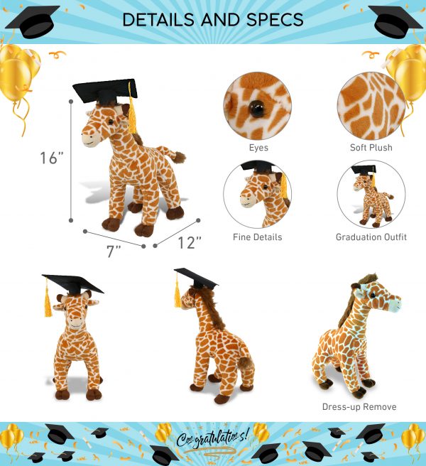 - INCLUDED WITH THE PURCHASE – Includes 1 Large Wild Giraffe Plush Toy in a graduation cap. The adorable giraffe plush animal is wearing a removable black graduation cap with a yellow tassel. Decorated with realistic designs and fluffy plush that makes the graduation custom wild giraffe perfect for cuddles and snuggles. This cute giraffe graduation stuffed toy measures about 12Lx7Wx16H inches.