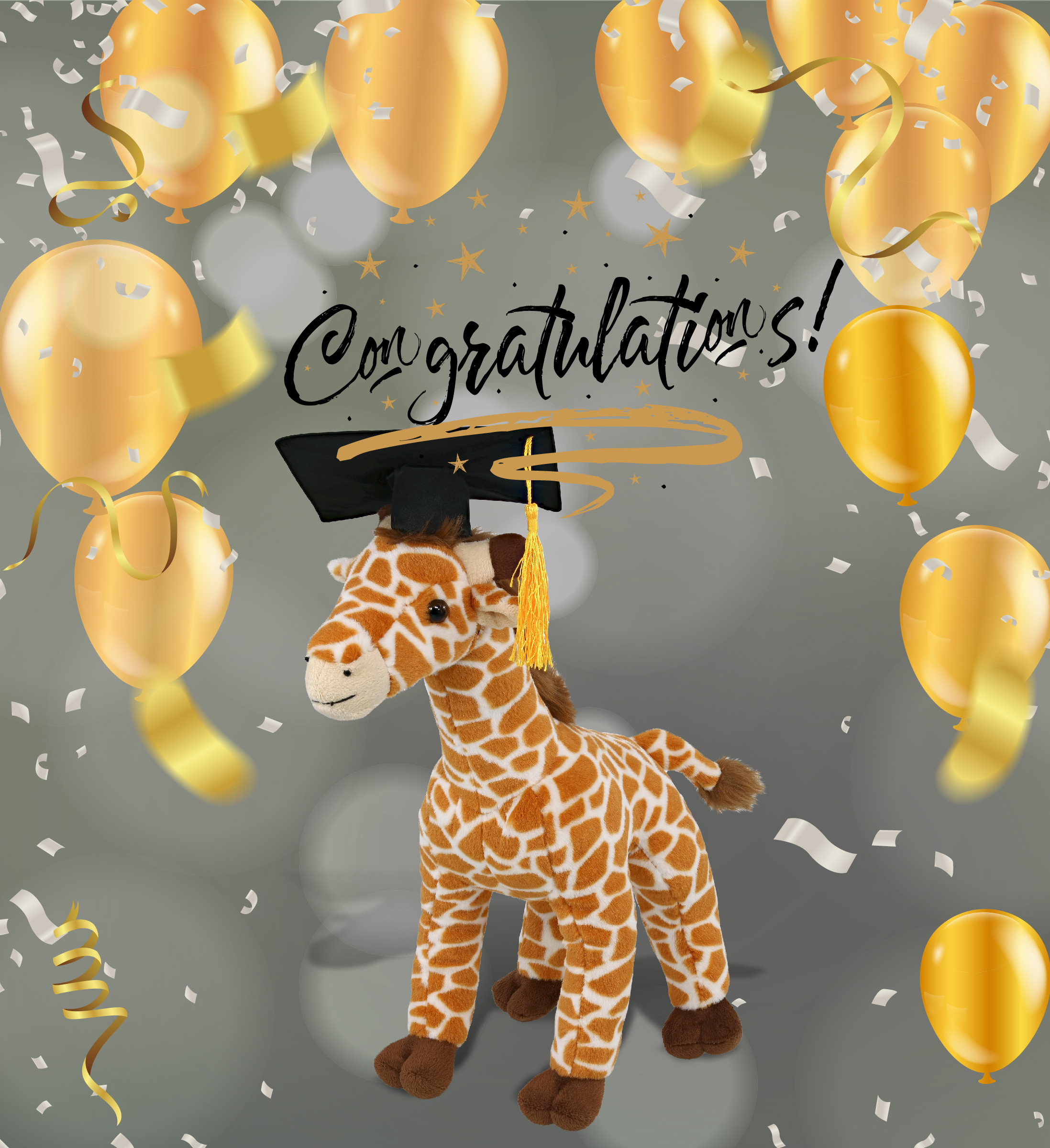 - HIGH-QUALITY GRADUATION PLUSH GIRAFFE- The soft giraffe stuffed animal is a cute and cuddly plush, made from premium quality polyester and stuffed with soft fillings. Covered with super soft brown and white fluffy plush. A snuggly animal crafted with durable materials, designed to deliver your congratulatory message to your loved one in an adorable way. To maintain the cleanliness of the plush, surface wash with cold water and allow to air dry.