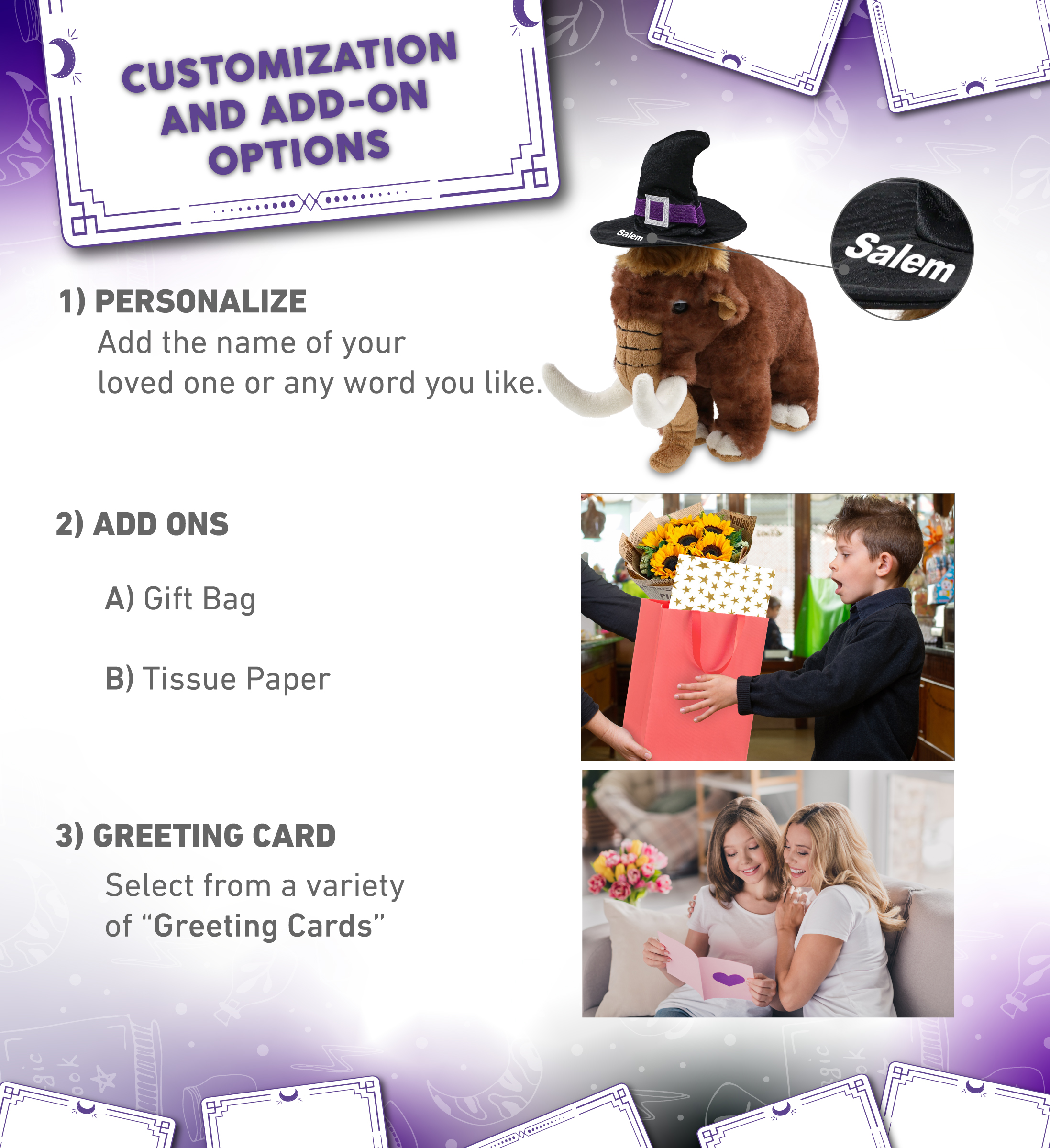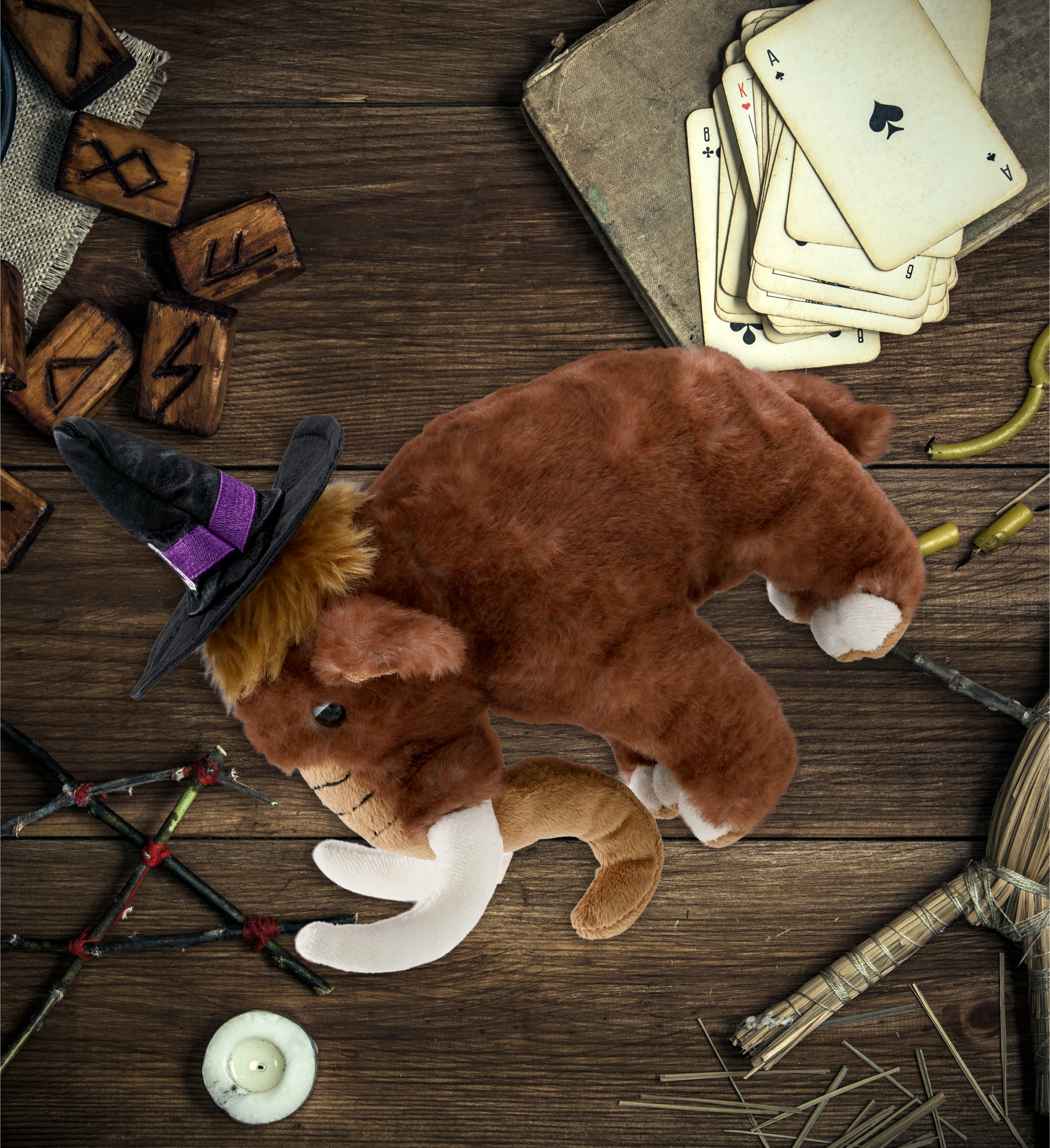- Personalization, Customization, and Add-On Options – The wild mammoth large Halloween plush toy comes dressed in a witch outfit, complete with a pointy black witch hat. Make your teddy bear doll special by adding a personalized name, which we will imprint onto the plush. You can also customize your witch mammoth stuffed animal by adding any of our add-ons to create the perfect gift: 1) Gift Bag 2) Tissue Paper 3) Greeting Card.
