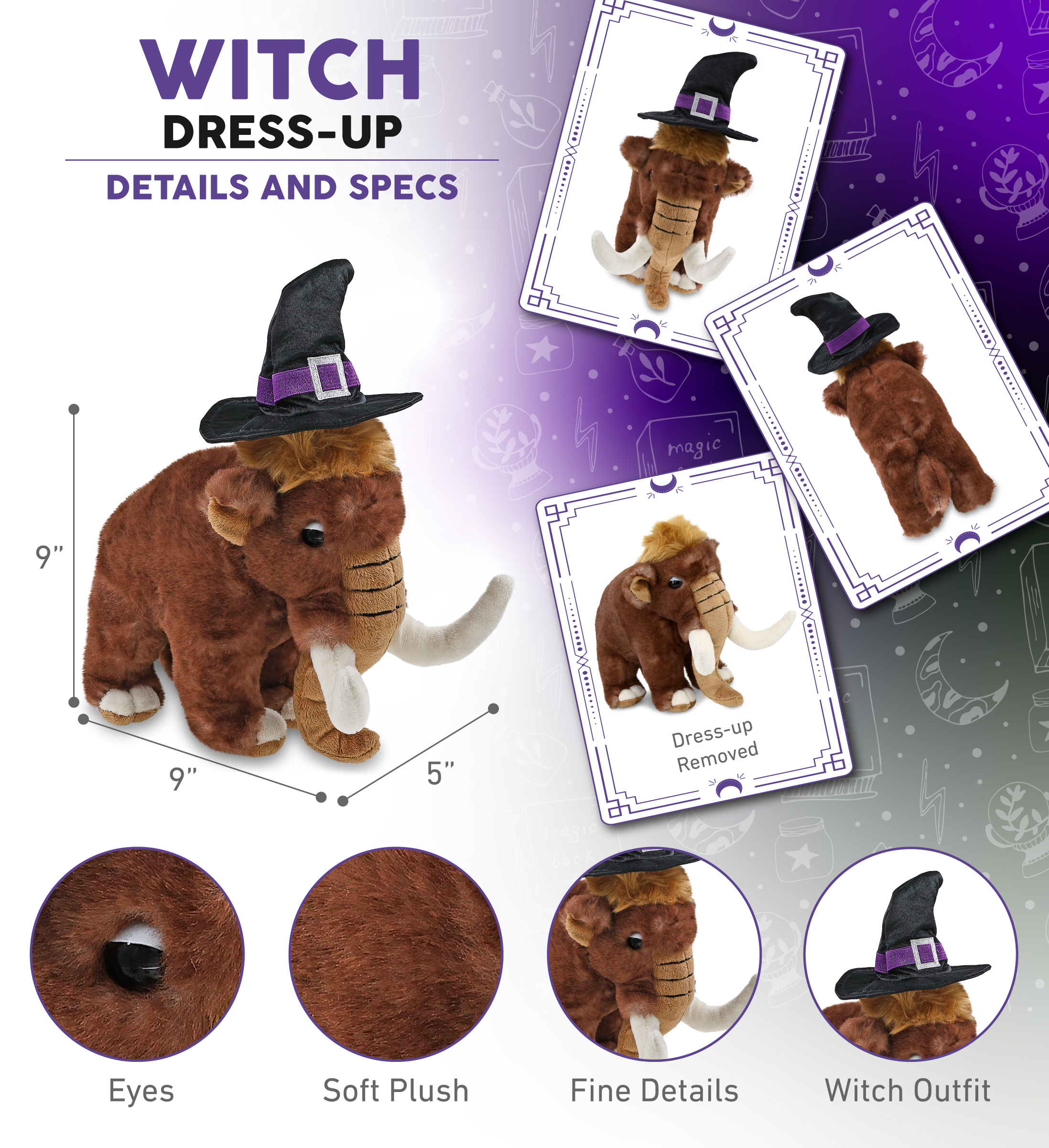 - Includes 1 DolliBu Wild Mammoth Large Toy Dressed in Witch Costume – The plush mammoth arrives with a witch stuffed animal outfit hat. The witch stuffed mammoth toy features a black witch dress up set hat with intricate purple details. The perfect mammoth plush to add spooky vibes to a display, along with your other Halloween stuffed animals. A cute stuffed animal mammoth that measures 9Lx5Wx9H inches and is perfect for 3 years and up.