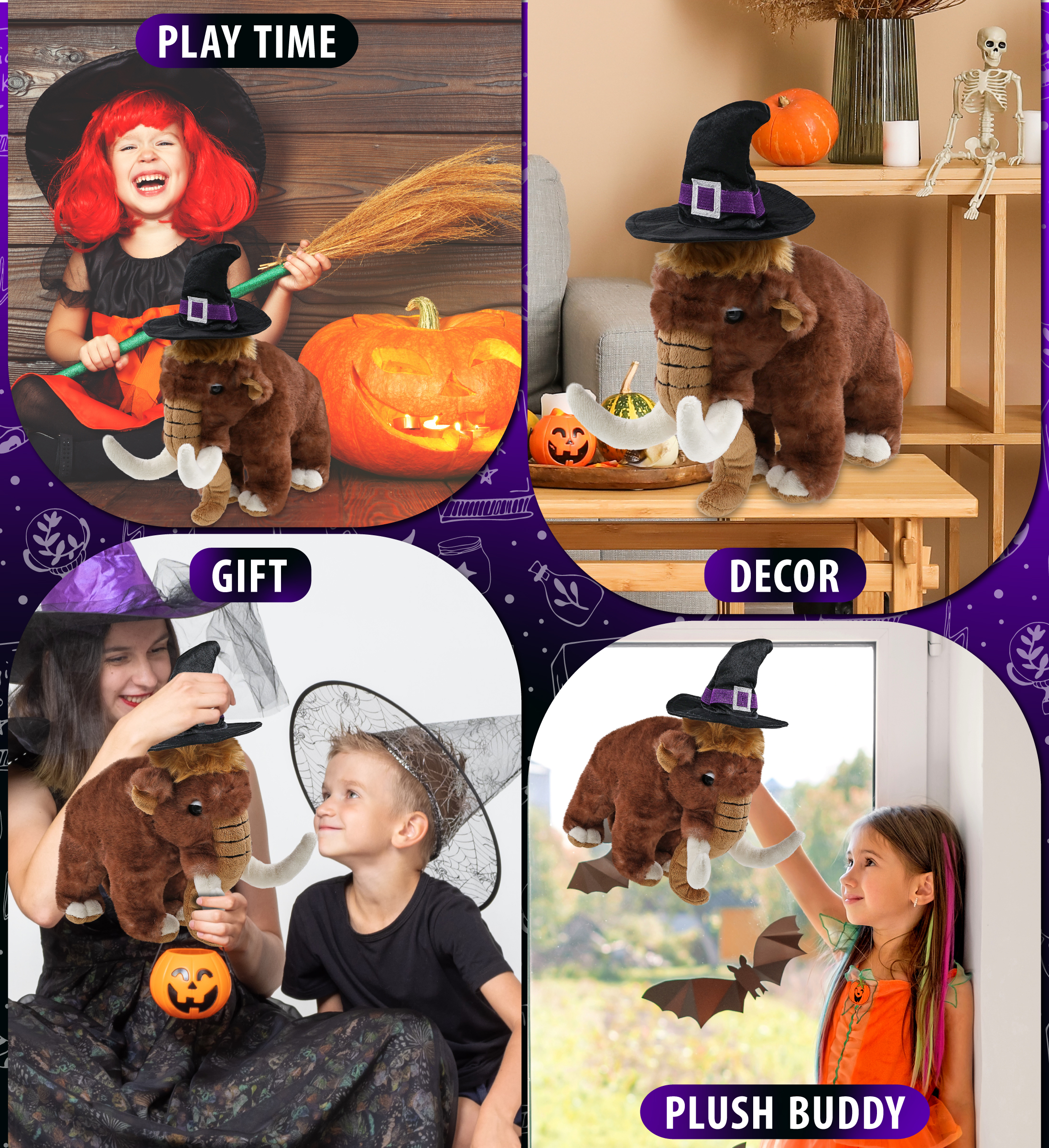 - Features a Teddy Bear Halloween Plush Wearing Witch Plush Doll Hat – This cute witch mammoth stuffed toy comes dressed in a pointy black witch hat decor with a silver buckle and purple band, completing the spooky Halloween teddy bear look. The mammoth plush toy witch costume hat is removable and fits snugly on the mammoth Halloween witch doll.