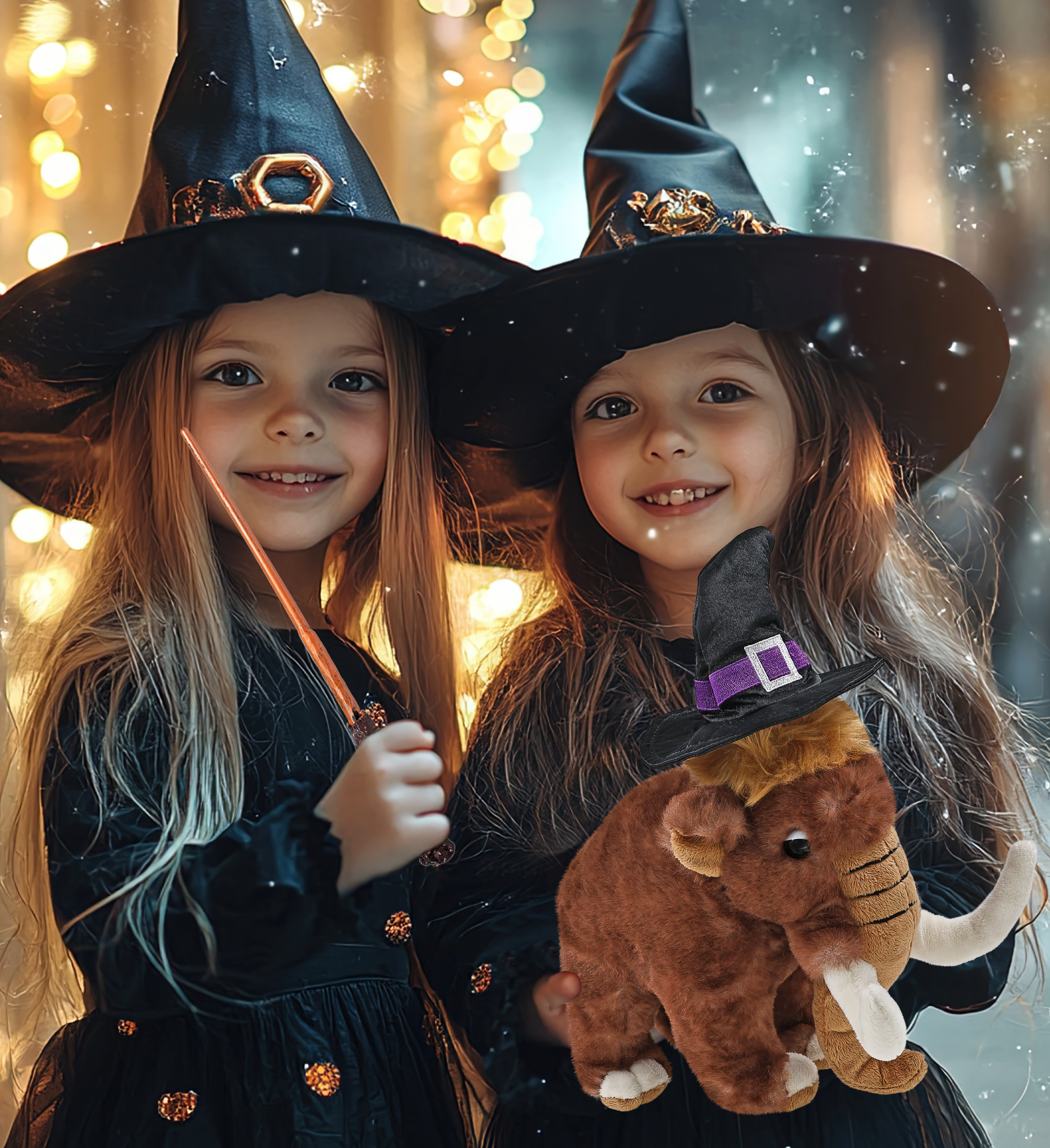 Everyone who loves witch stuff and stuffed witch dolls for kids will be thrilled to get this mammoth stuffed animal with witch costume hat. Perfect addition to your Halloween stuffed toys and witch doll decor. Ideal Halloween themed gifts for fans of cute Halloween themed plush toys, mammoth themed gifts, witch toys, and collectors of spooky toys for kids. This cute witch stuffed mammoth plush comes dressed in a pointy black hat witch accessory, designed with a silver buckle and purple band, completing the spooky Halloween teddy bear look. The plush Halloween mammoth witch costume hat is removable and fits snugly on the mammoth witch spooky plush. The mammoth Halloween plush toy comes dressed in a witch outfit with a pointy black witch hat. Make your teddy bear doll special by adding a personalized name, which we will imprint onto the plush. You can also customize your witch mammoth stuffed animal by adding any of our add-ons to create the perfect gift: 1) Gift Bag 2) Tissue Paper 3) Greeting Card. The cute Halloween stuffed animal plush mammoth with a witch black hat is made with super-soft, durable, premium-quality polyester materials. The witch doll for kids is designed for everyday hugs and creative dress-up fun, blending witch style with fun animal charm. The witch stuffed Halloween plush clothes hat can be placed on top of the head for quick and easy dressing. The plush teddy bear arrives with a cute hat for a witch. The witch stuffed mammoth toy features a black witch dress up set hat with intricate purple details. The perfect teddy bear plush that measures 9Lx5Wx9H inches to add spooky vibes to a display, along with your other Halloween stuffed animals. A cute witch Halloween teddy bear plush for anyone ages 3 and up who is looking for a cute mammoth figure.