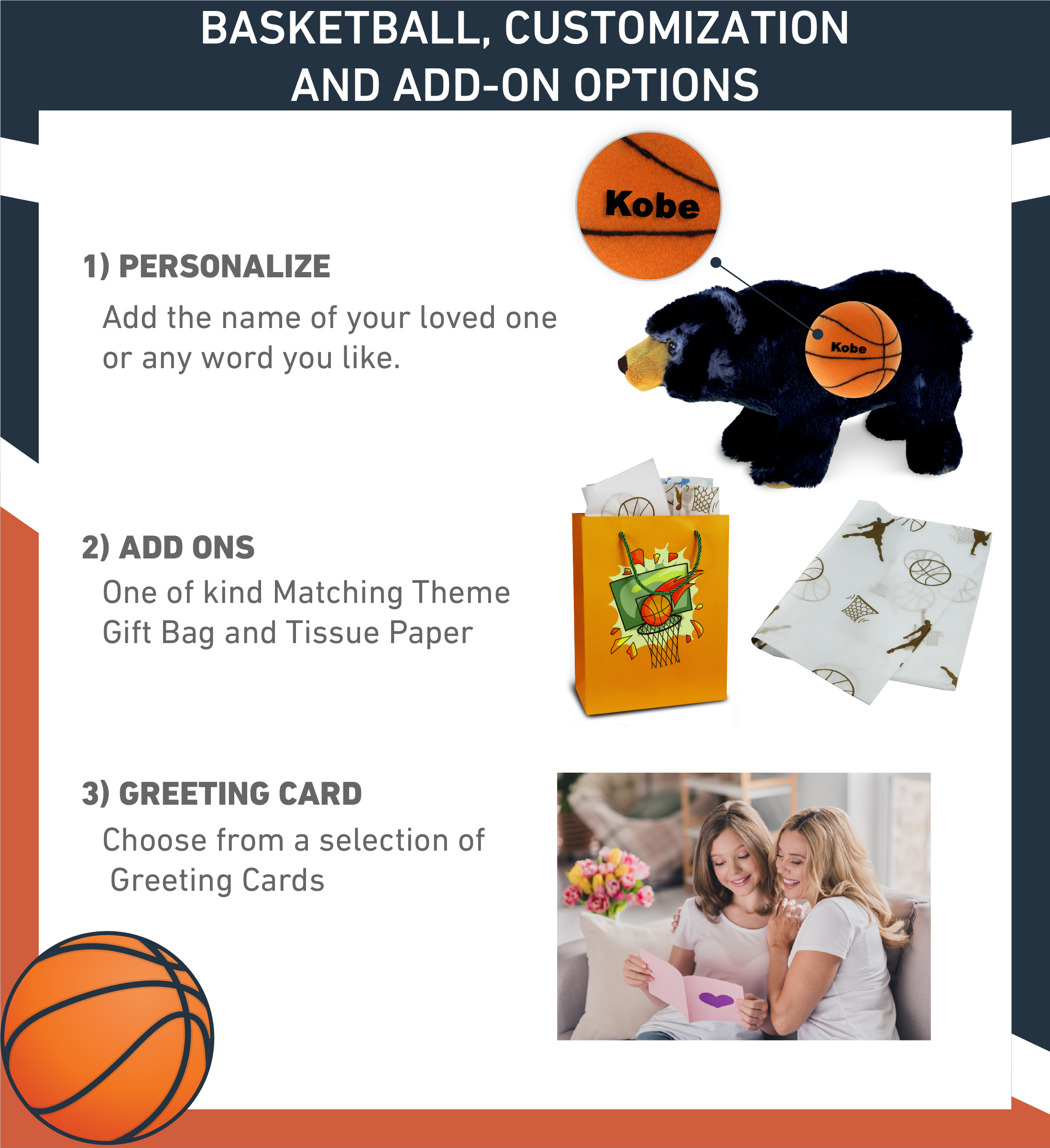 - Personalization, Customization, and Add-On Options – The Super Soft Sports Stuffed Animal Wild Small Black Bear comes customized with a Basketball Plush. You can personalize your black bear plush toy with the name of your loved one, which we will imprint on the item. You also have the option to add some or all of the cool add-ons to make your plush gift extra special: 1) Gift Bag; 2) Tissue Paper; 3) Greeting Card.