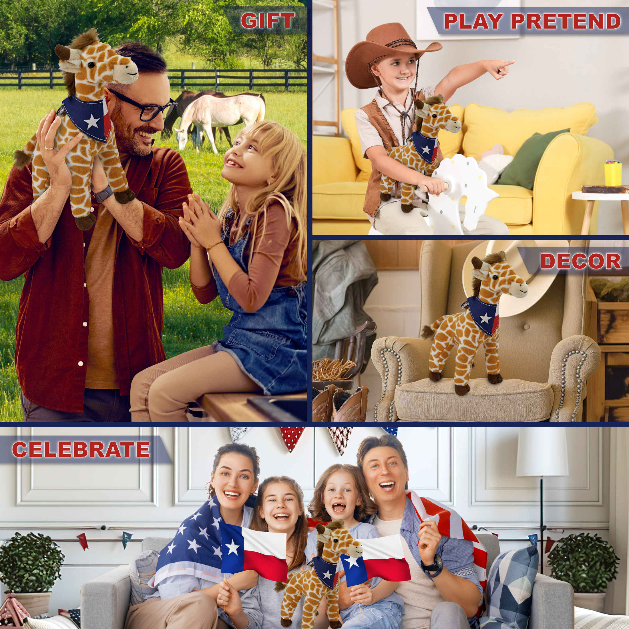 - Includes 1 DolliBu Wild Giraffe Doll with Texas Flag Neck Scarf – This soft and cuddly teddy bear plush comes with a removable red, blue, and white Texas flag bandana, giving it cowboy-Texan vibes. The giraffe’s western cowboy accessories make it a standout addition to any cowboy toys collection, and it pairs well with other Texas themed gifts. This giraffe plush doll measures 10Lx4Wx12.5H inches. Best for kids ages 0 and up.