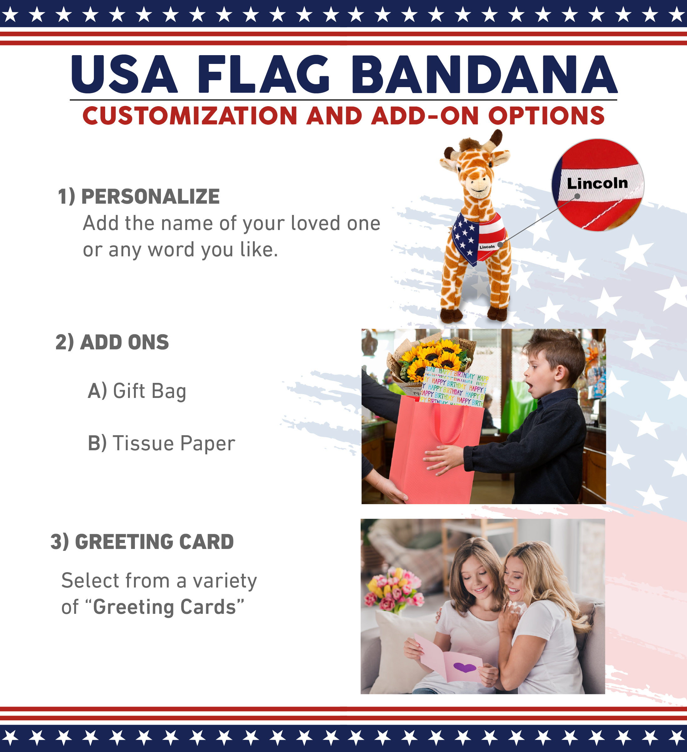 - Personalization, Customization, and Add-On Options – The stuffed giraffe plush toy comes dressed with a removable USA Flag Bandana to give a unique patriotic twist. Make the plush giraffe toy cool and unique by personalizing it with the name, which we will imprint directly onto the plush. You can also customize your plush giraffe by adding any of our add-ons to create the perfect gift: 1) Gift Bag 2) Tissue Paper 3) Greeting Card.