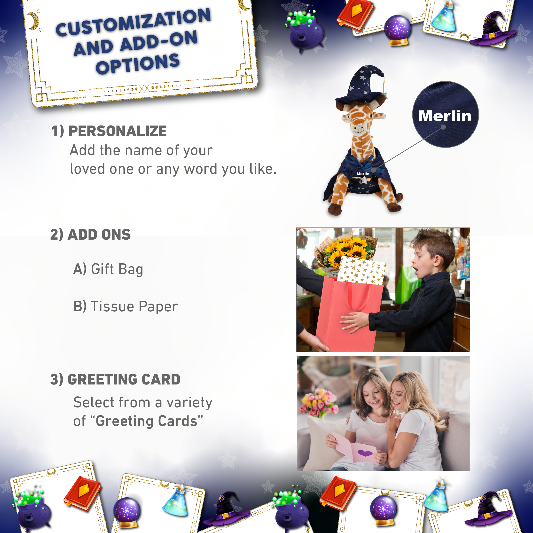 - Personalization, Customization, and Add-On Options – The wld small giraffe stuffed animal comes dressed in a full wizard outfit, with a wizard cloak and hat with star details. Make your wizard stuffed giraffe special by adding a personalized name, which we will imprint onto the plush. You can customize your plush wizard toy by adding any of our add-ons to create the perfect gift: 1) Gift Bag 2) Tissue Paper 3) Greeting Card.
