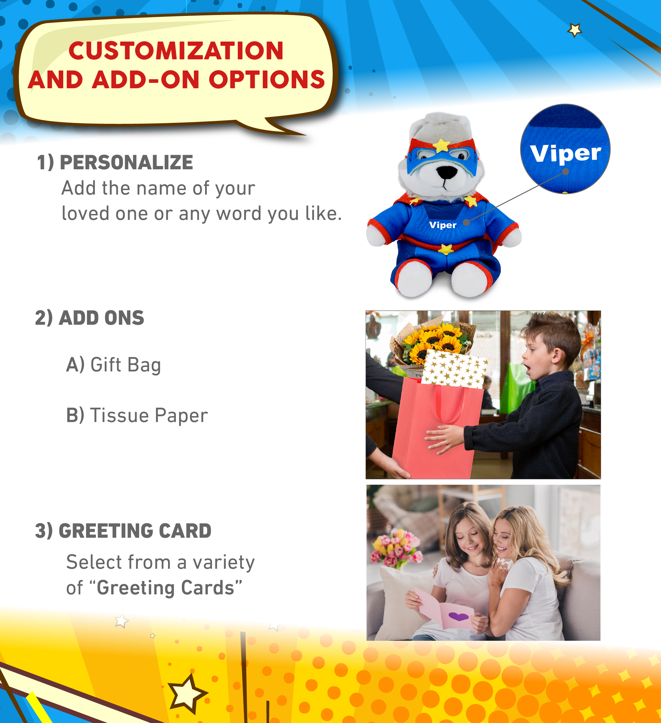 - Personalization, Customization, and Add-On Options – The wolf stuffed toy comes dressed in a full superhero outfit, complete with an eye mask, cape, and star details. Make your wolf doll special by adding a personalized name, which we will imprint onto the plush. You can also customize your wolf plush hero toy by adding any of our add-ons to create the perfect gift: 1) Gift Bag 2) Tissue Paper 3) Greeting Card.