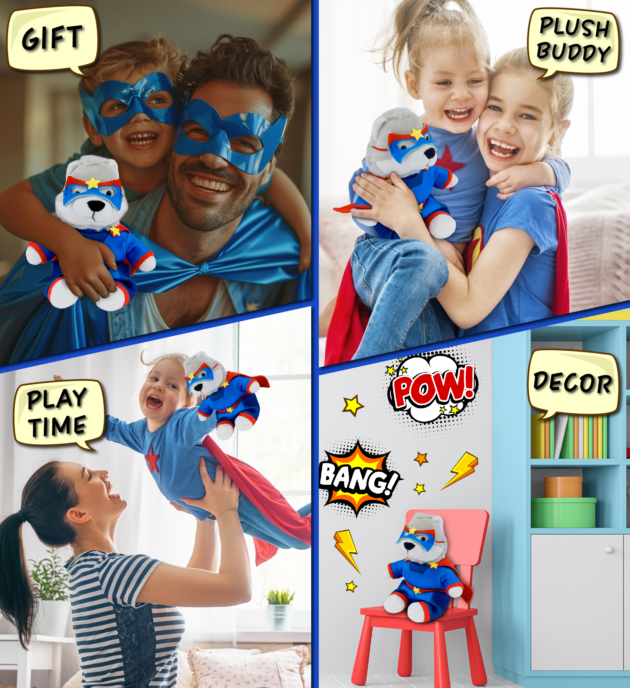 - Features a Teddy Bear Wolf Wearing Superhero Stuffed Animal Clothing – With a mask, suit, and cape, this wolf stuffed plush toy comes with a playful and stylish look that results in two fun themes: wildlife and superheroes! Whether you’re searching for super heroes plush toys, stuffed animal outfits, or wolf figures with personality, this cute plush wolf adds charm to any toy shelf, room décor, or Halloween plush collection.