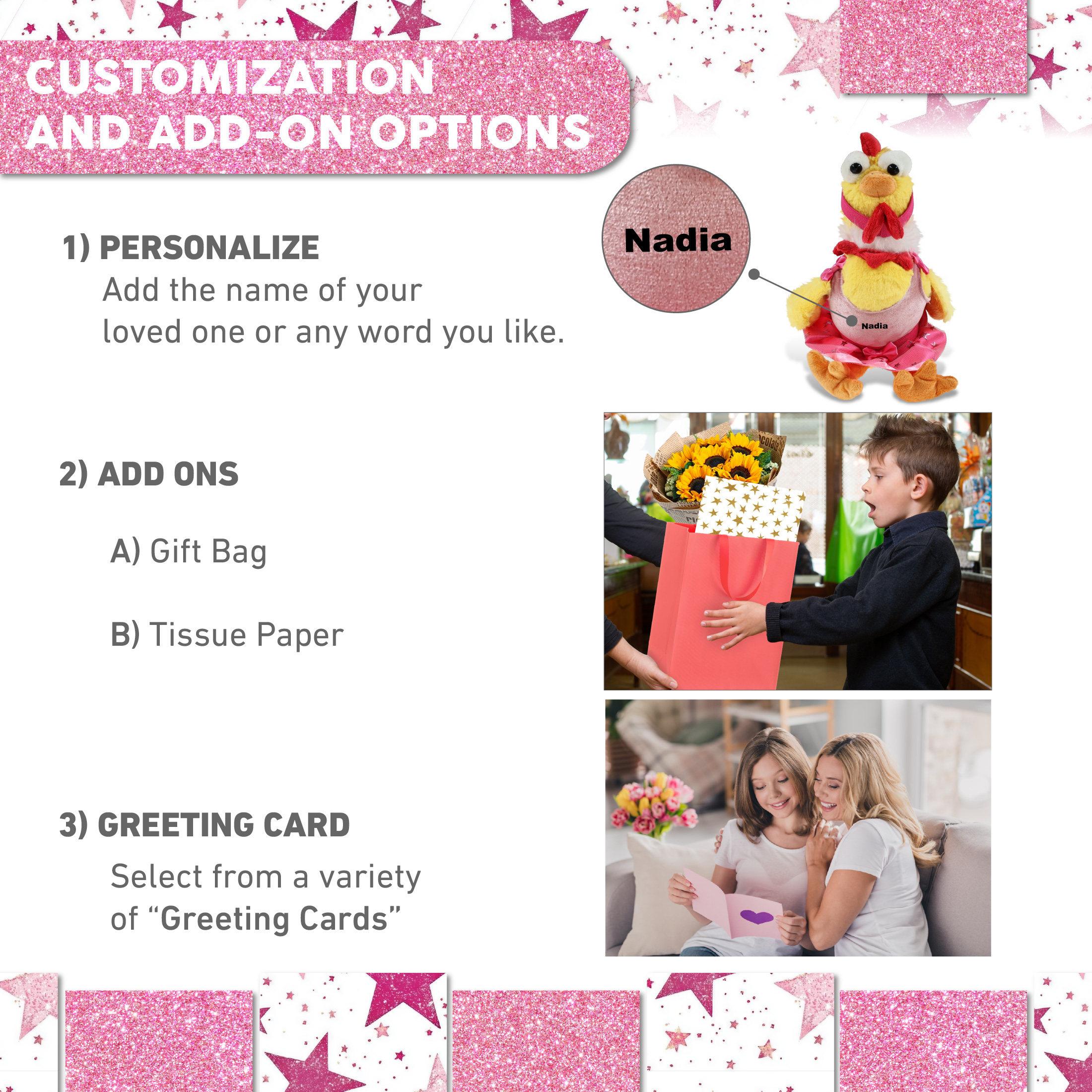 - Personalization, Customization, and Add-On Options – The yellow rooster plush toy comes dressed in a charming pink ballerina outfit, complete with tutu skirt, headband, and shirt. Make it meaningful by personalizing it with the name, which we will imprint directly onto the plush. You can also customize your ballerina rooster stuffed animal doll by adding any of our add-ons to create the perfect gift: 1) Gift Bag 2) Tissue Paper 3) Greeting Card.