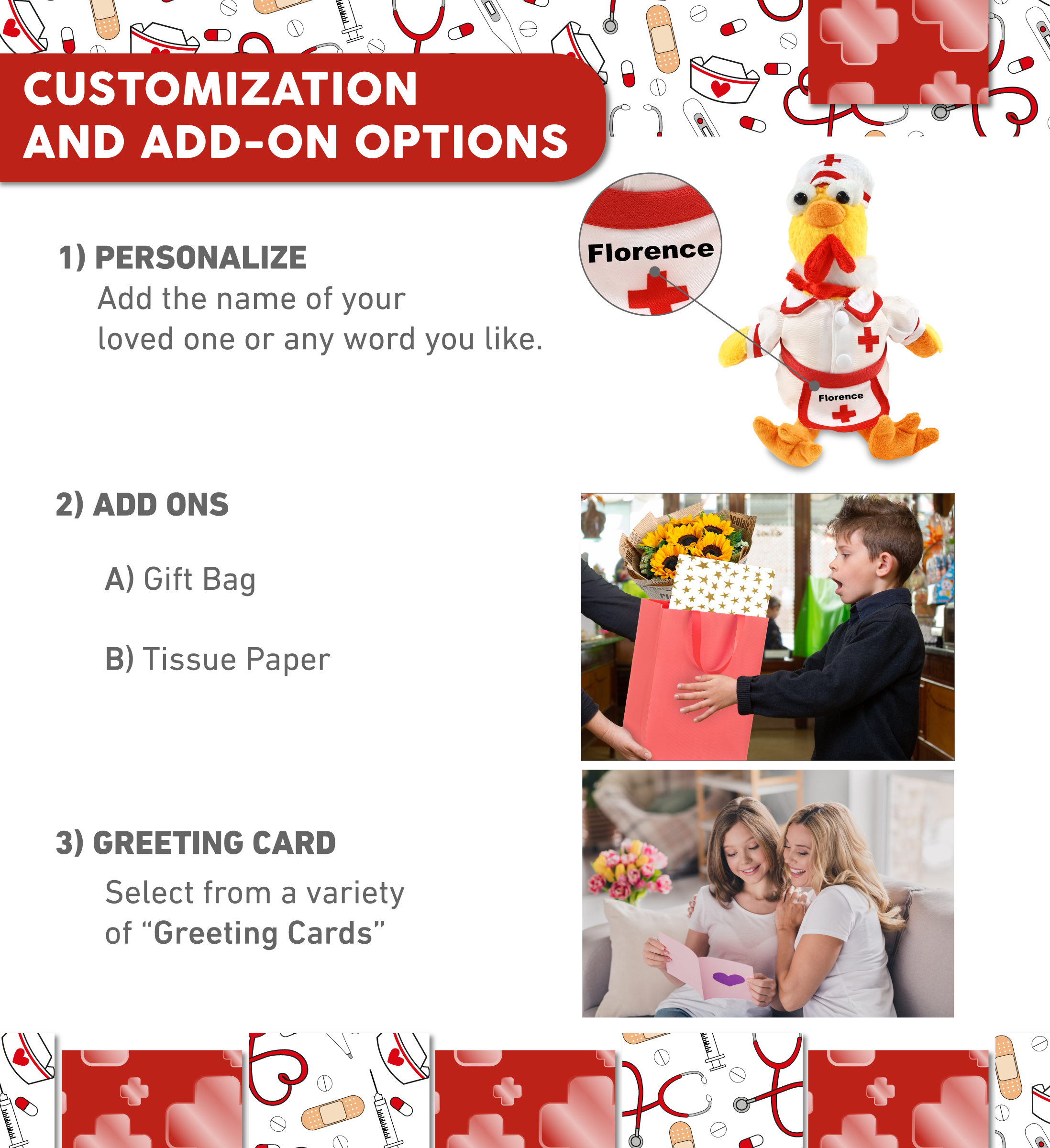 - Personalization, Customization, and Add-On Options – The stuffed Rooster comes dressed in a cute nurse costume, complete with nurse cap, nurse dress and apron. Make your nurse teddy bear stuffed animal plush special by adding a personalized name, which we’ll imprint onto the plush. You can also customize your nurse rooster plush by adding any of our add-ons to create the perfect gift: 1) Gift Bag 2) Tissue Paper 3) Greeting Card.