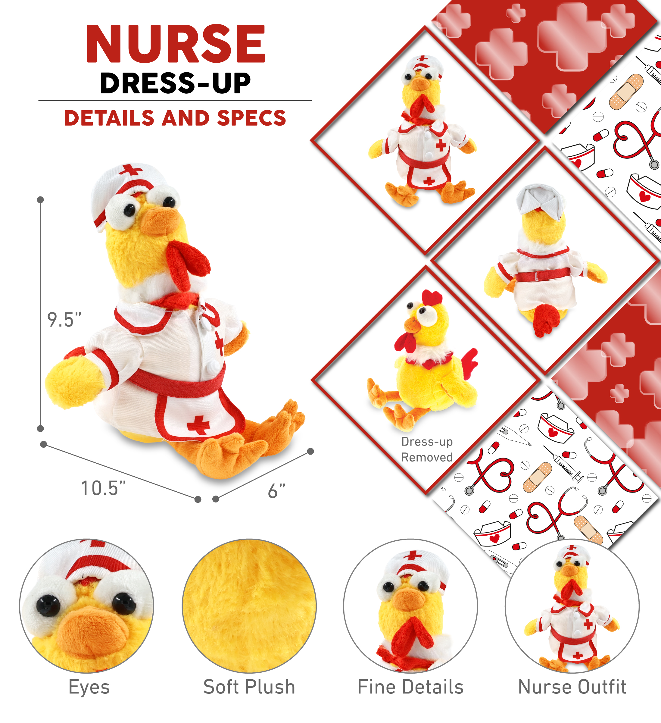 - Yellow Rooster with Nurse Stuffed Animal Clothes Features a Classic Nurse Outfit – Designed with red lining and a cross against the white nurse dress and the nurse cap and apron. The rooster stuffed animal plush has soft plush, perfect for everyday snuggles. This stuffed animal with clothes makes the perfect addition to your collection of rooster teddy bear with clothes or giveaway hospital toys to give to sick children.