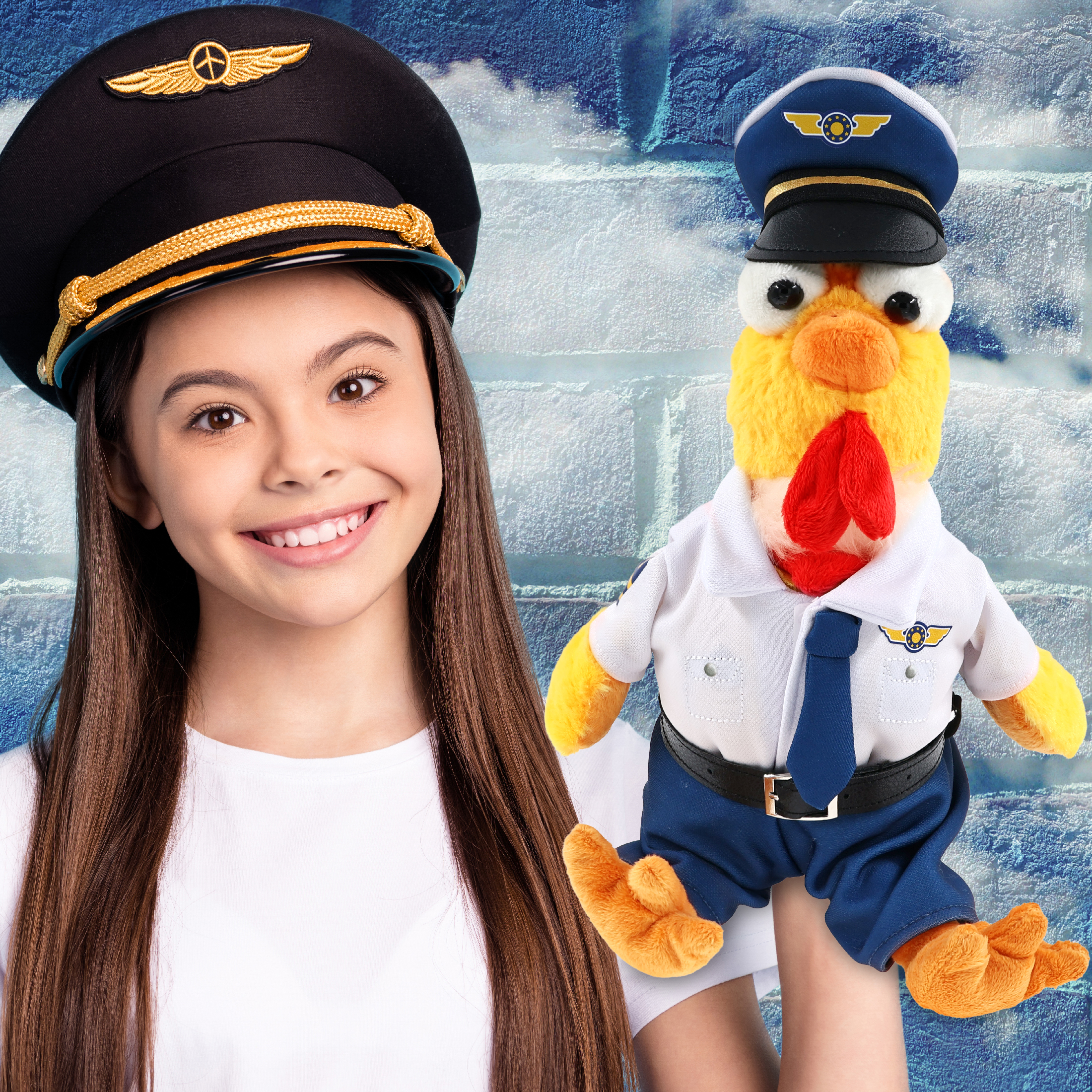 - Features a Cute Teddy Bear Plush with Pilot Uniform Costume – This rooster doll features ready-to-fly pilot clothes for teddy bears. The rooster plush features cool details and realistic design, while the pilot career dress up costume features a white button-up aviation uniform shirt with printed pilot wings and sleeve stripes, blue pants with an elastic waistband, a black belt, a matching blue tie, and a classic pilot captain hat.