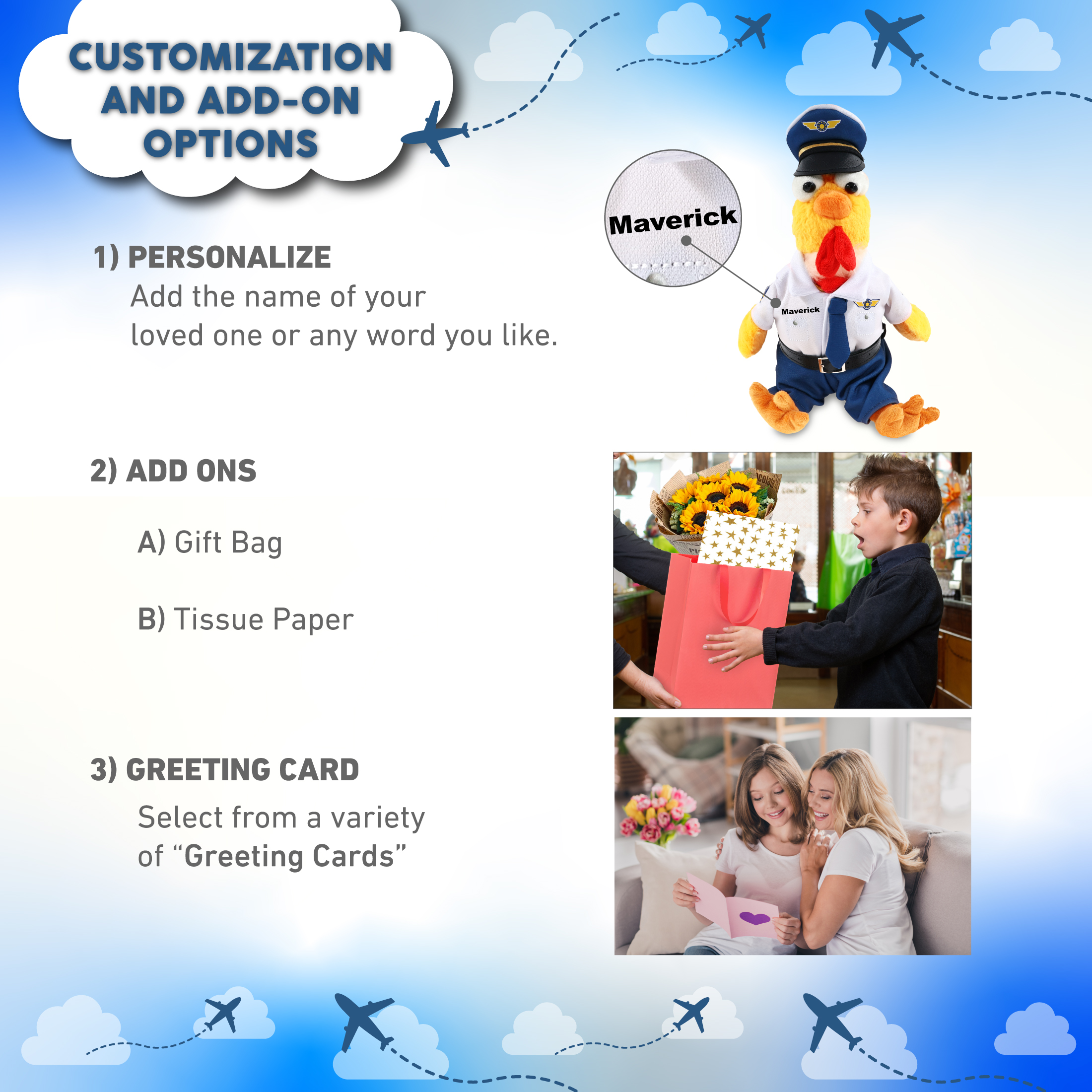 - Personalization, Customization, and Add-On Options – The rooster stuffed animal comes dressed in a full pilot outfit set, with a white pilot shirt, captain hat, belt, and pants. Make your pilot stuffed bear special by adding a personalized name, which we will imprint onto the plush. You can customize your plush pilot toy by adding any of our add-ons to create the perfect gift: 1) Gift Bag 2) Tissue Paper 3) Greeting Card.