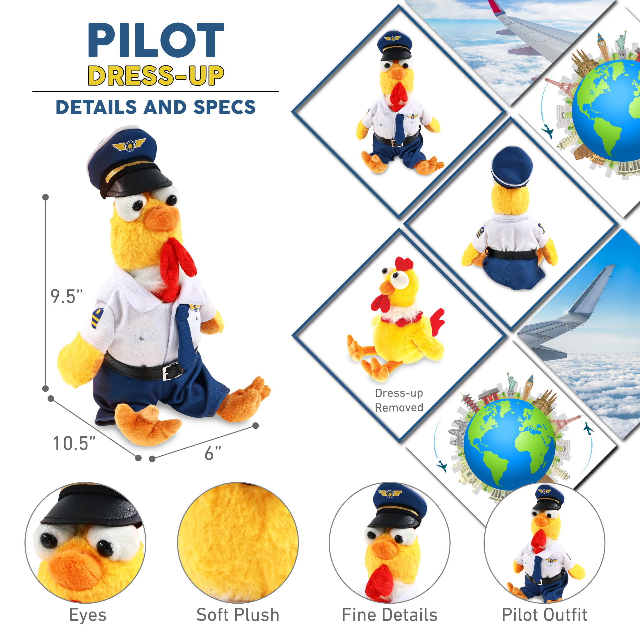 - Includes 1 DolliBu Yellow Rooster Toy with Pilot Stuffed Animal Clothes – This rooster plush animal arrives in an airline pilot costume. Dressed in a white shirt, pants, belt, tie, and captain hat costume, perfect for dress up, travel themes, or playtime flight adventures. Great Halloween pilot costume for your plush toys or as aviation lover gifts. This cute rooster wearing pilot clothes for stuffed animals measures 10.5Lx6Wx9.5H inches.