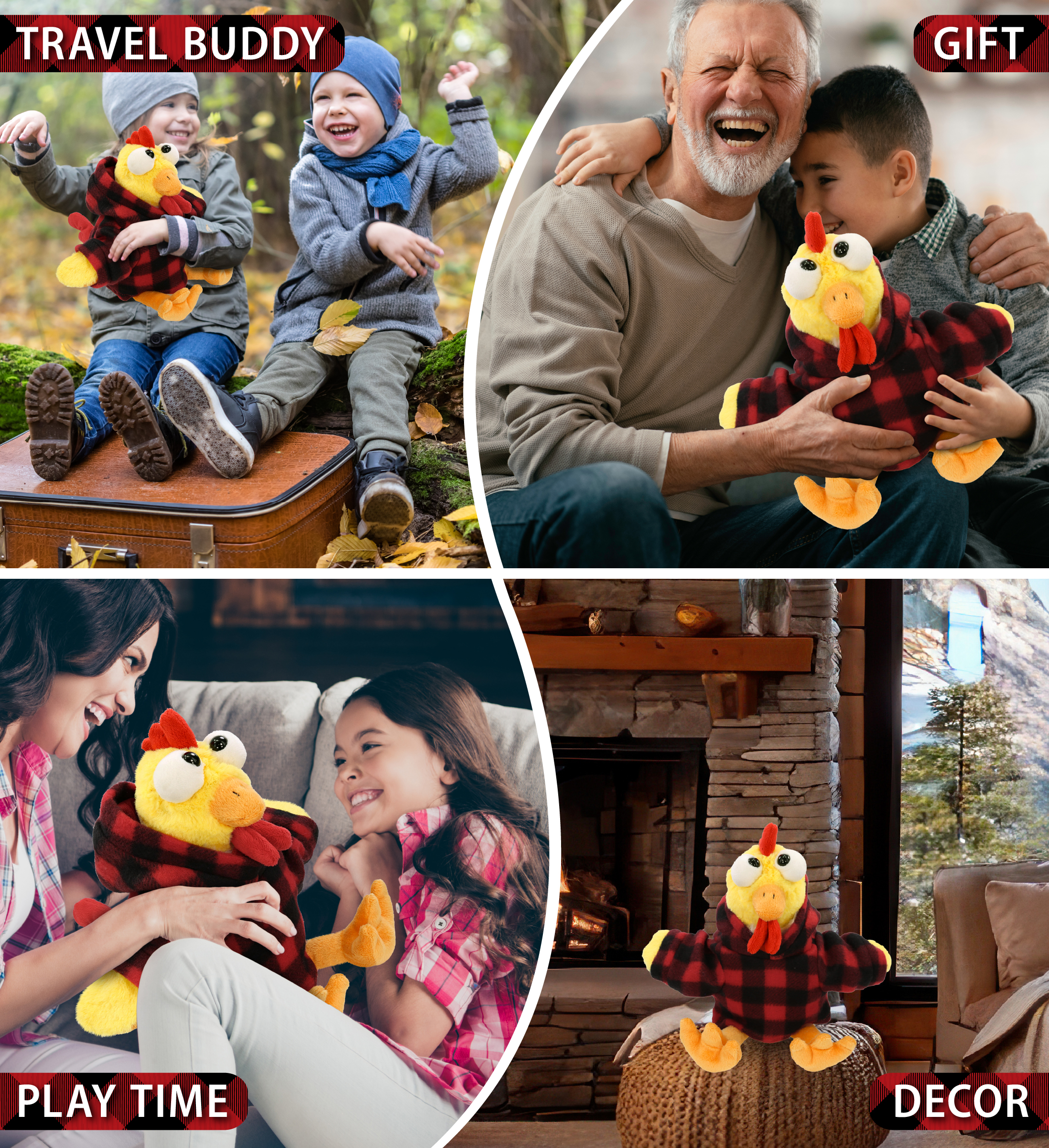 - Included with The Purchase of Rooster Plush with Red Plaid Hoodie Jacket – Includes 1 Yellow Rooster with Red Flannel Plaid Shirt. Dressed in flannel hooded jacket, the stuffed rooster is all about comfort and style, making it the perfect addition to your Christmas plush animals decor for your Christmas tree, ready to join your holiday photos or family gatherings. The rooster with cute red checkered shirt measures 10.5Lx6Wx9.5H inches.