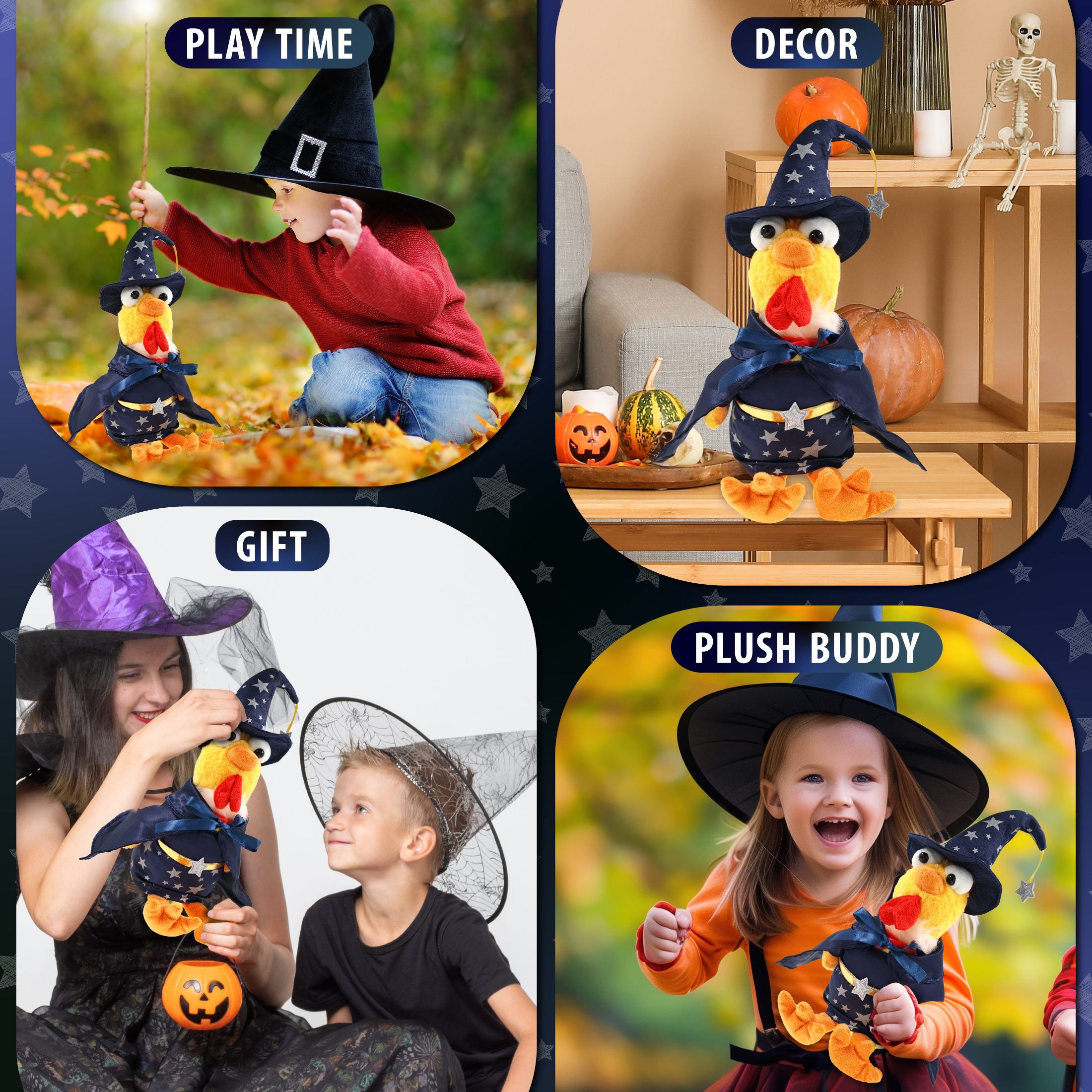 - Features a Cute Rooster Plush with Wizard Stuffed Animal Clothes – With a wizard cloak and wizard stuffed animal hat adorned with silver stars, this rooster Halloween stuffed animal has a playful and stylish magical look! The detailed wizard fantasy outfit adds character to your stuffed toys and makes them stand out among other cute rooster figures. Everyone will love to play with a huggable stuffed animal with wizard clothes for stuffed animals.
