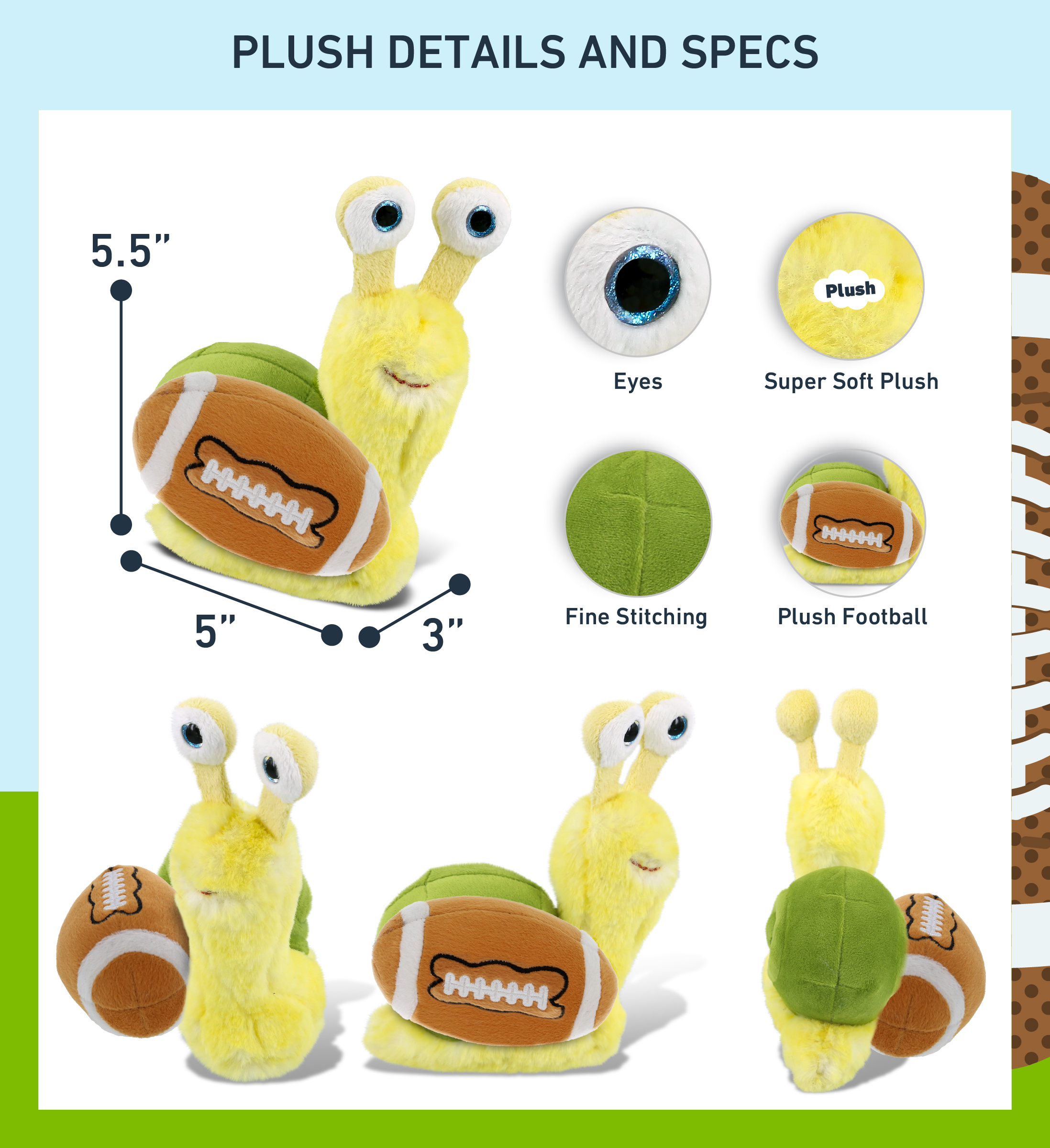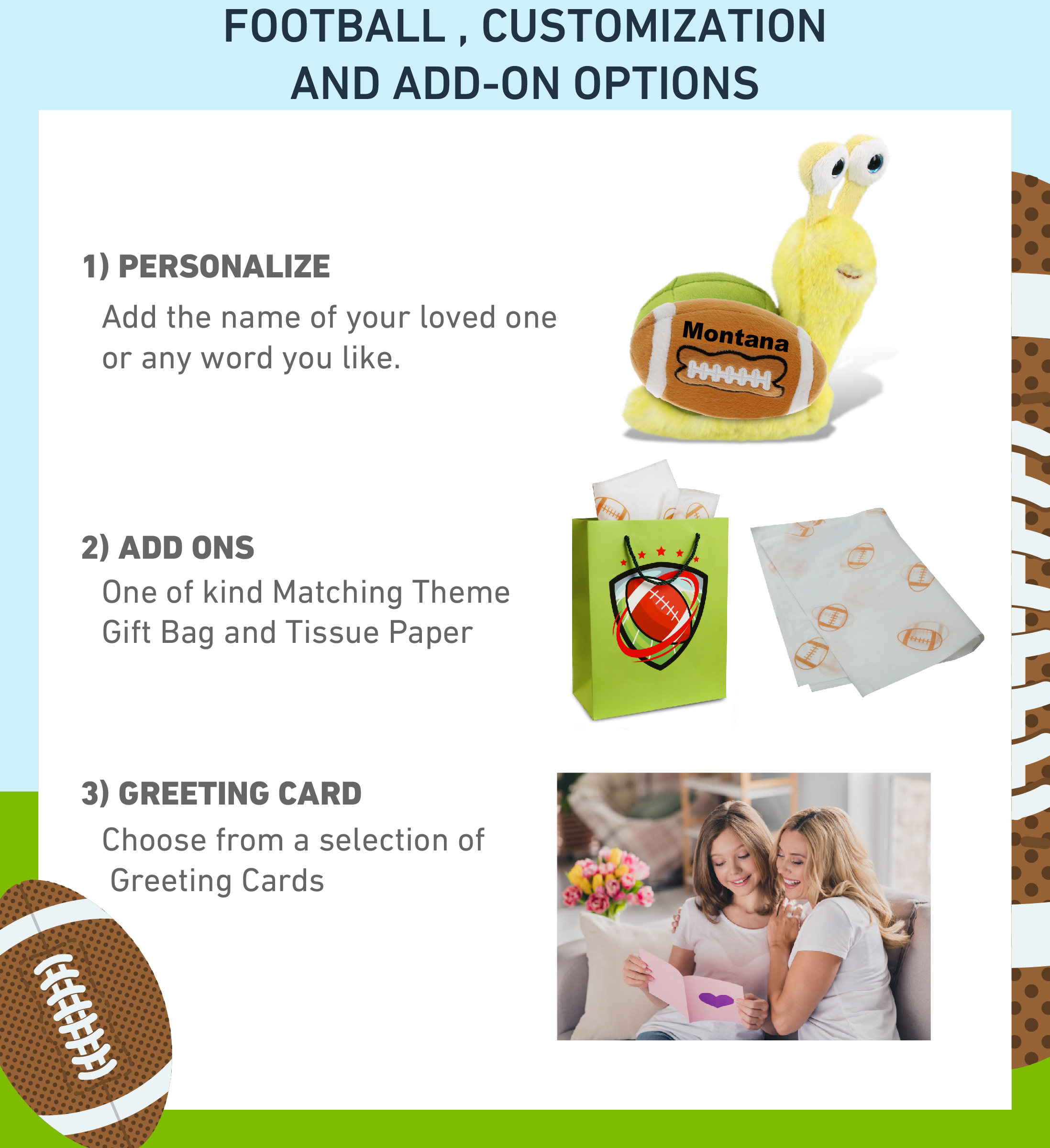 - PERSONALIZATION, CUSTOMIZATION, AND ADD-ON OPTIONS – Super Soft Sports Stuffed Animal Small Yellow Snail comes customized with a Football Plush. You can personalize it with the name of your loved one imprinted on the item. You also have the option to add some or all of the cool add-ons to make your gift extra special: 1) Gift Bag; 2) Tissue Paper; 3) Greeting Card.