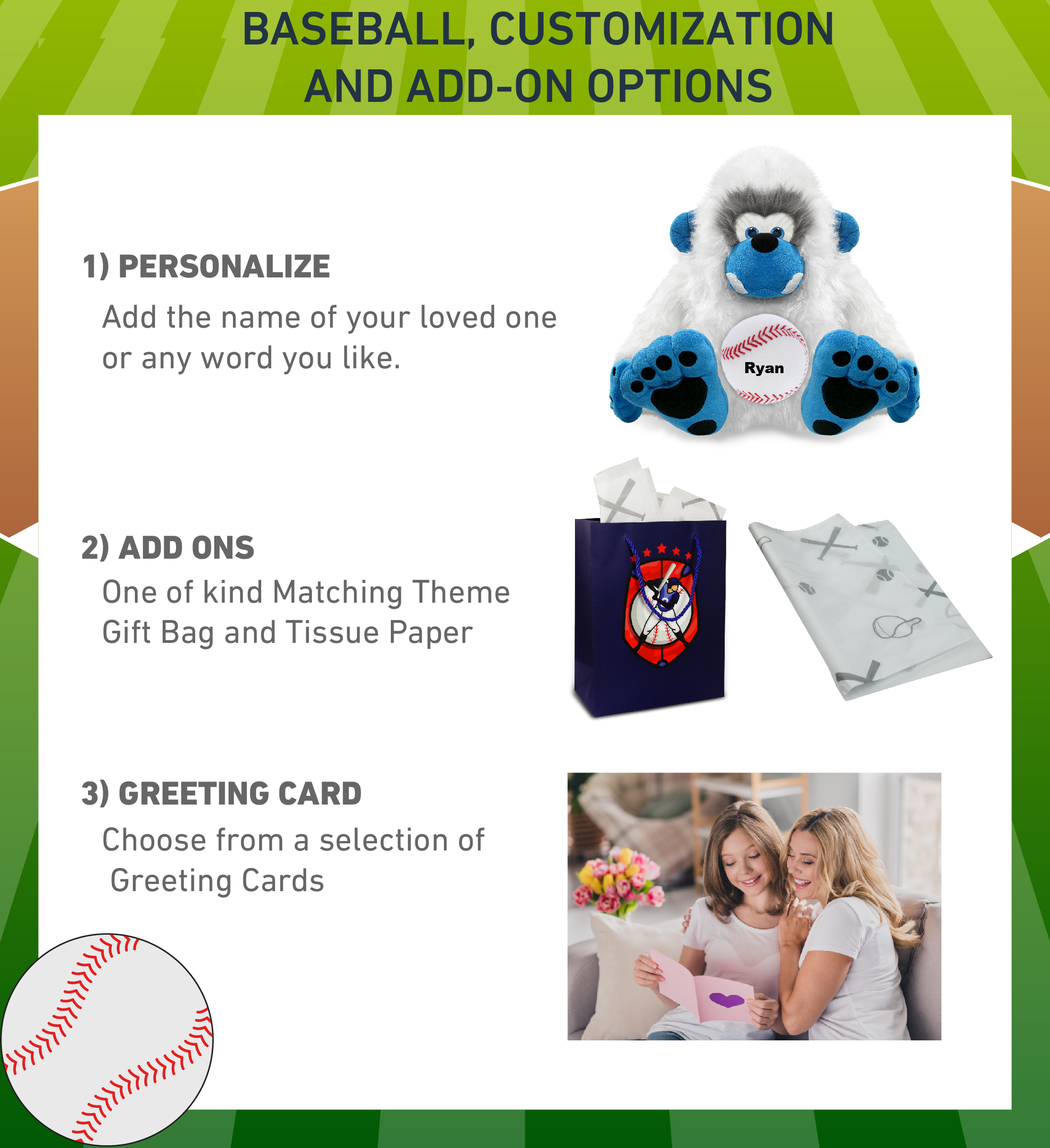 - Personalization, Customization, and Add-On Options – The Super Soft Sports Stuffed Animal Yeti comes customized with a small baseball plush. You can personalize your stuffed animal Yeti with the name of your loved one which we will imprint on the item. You also have the option to add some or all of the cool add-ons to make your gift extra special: 1) Gift Bag; 2) Tissue Paper; 3) Greeting Card.