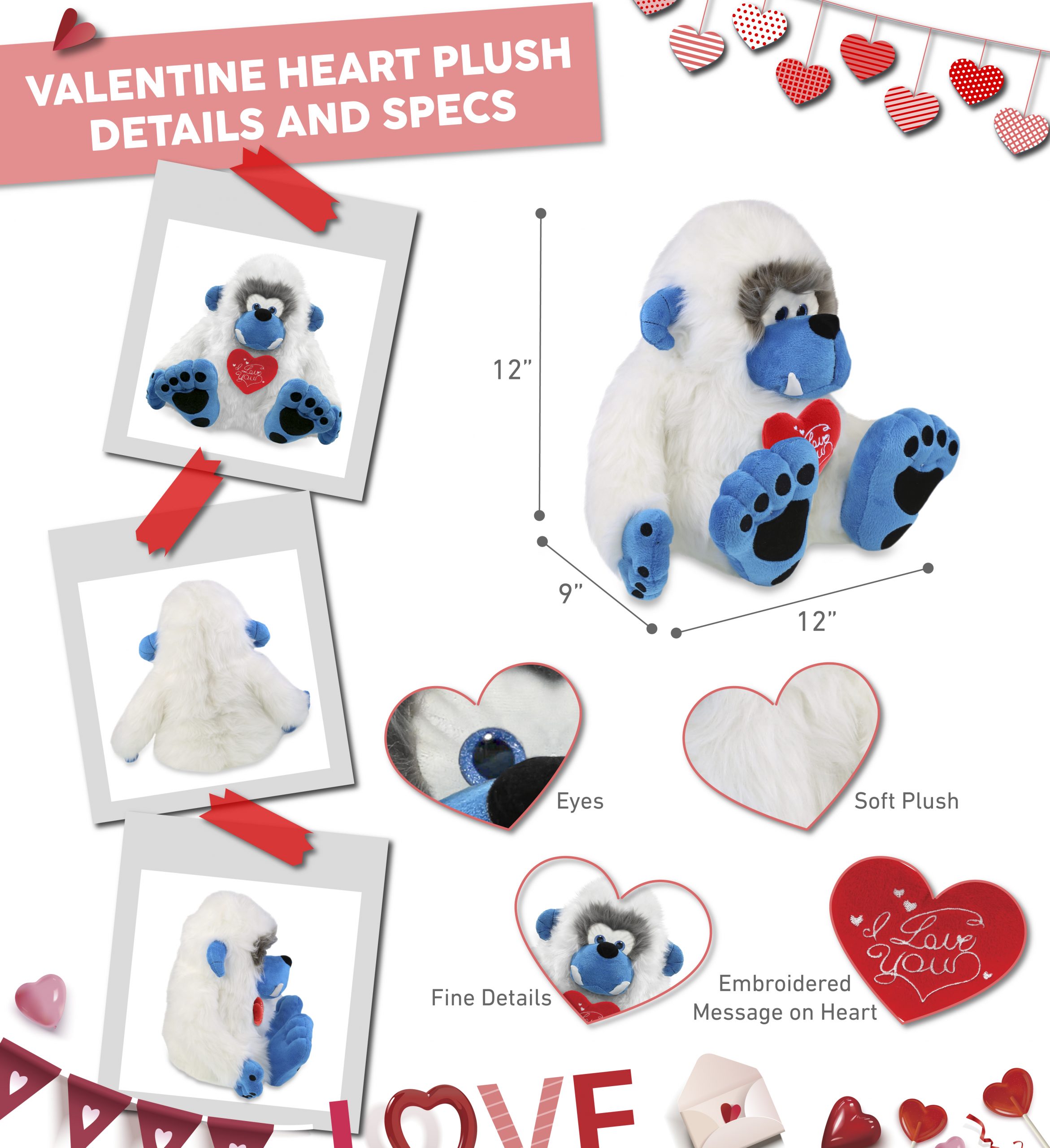 - INLUDED WITH THE PURCHASE OF VALENTINE PLUSH – Includes 1 DolliBu Super Soft Yeti Valentines Day Stuffed Animal Plush with a romantic message embroidered on the red stuffed heart plush. Make this Valentine’s Day plush a sweet stuffed animal Valentine gift for boyfriend or girlfriend. husband, wife, or a cute yeti plush surprise for your kids who love playing with stuffed yetis. The stuffed yeti plush measures 12Lx9Wx12H inches.