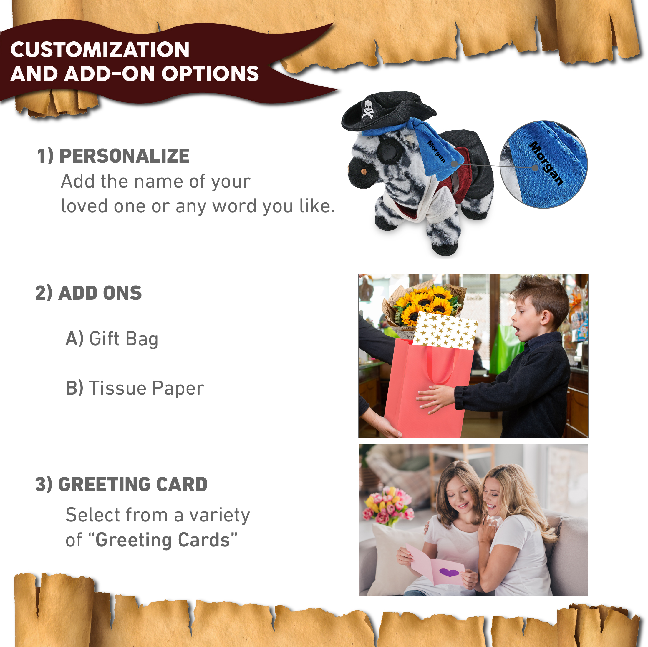 - Personalization, Customization, and Add-On Options – The zebra figure stuffed toy comes dressed in full pirate clothes, complete with pirate hat, pirate vest, pirate shirt, pants, belt, and pirate mask. Make your bear doll special by adding a personalized name, which we will imprint onto the plush. You can also customize your stuffed animal by adding any of our add-ons to create the perfect gift: 1) Gift Bag 2) Tissue Paper 3) Greeting Card.