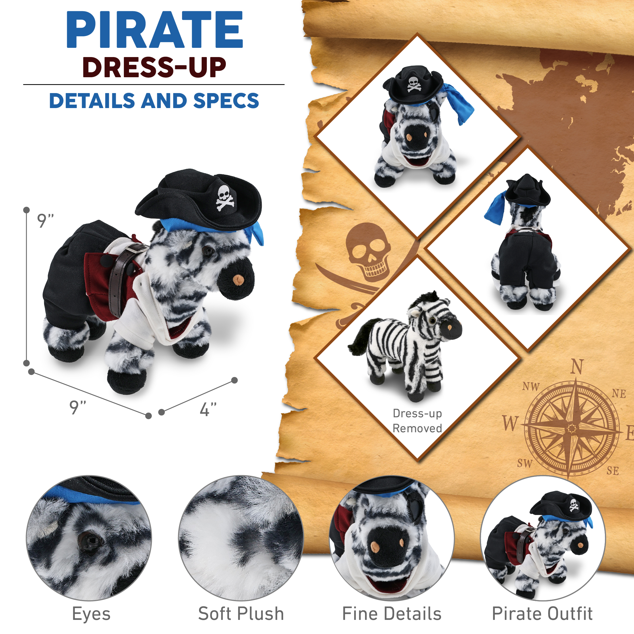 - Includes 1 DolliBu Super Soft Zebra Stuffed Toy with Pirate Outfit – The zebra toy wears a pirate teddy bear costume featuring a pirate vest, belt, shirt, pants, and pirate hat. Whether you’re collecting zebra toys or hunting for pirate stuff for kids, this plush is the perfect combo of silly plush fun and dress-up adventure. This cute pirate stuffed animal zebra measures approximately 9Lx4Wx9H inches and is for kids ages 3 and up.