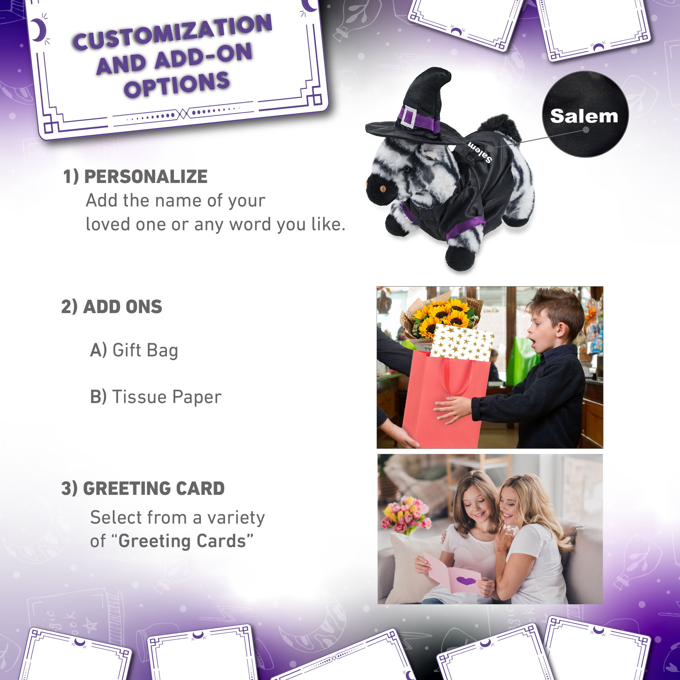 - Personalization, Customization, and Add-On Options – The zebra Halloween plush toy comes dressed in a witch outfit, complete with black and purple cloak and pointy black witch hat. Make your teddy bear doll special by adding a personalized name, which we will imprint onto the plush. You can also customize your witch zebra stuffed animal by adding any of our add-ons to create the perfect gift: 1) Gift Bag 2) Tissue Paper 3) Greeting Card.