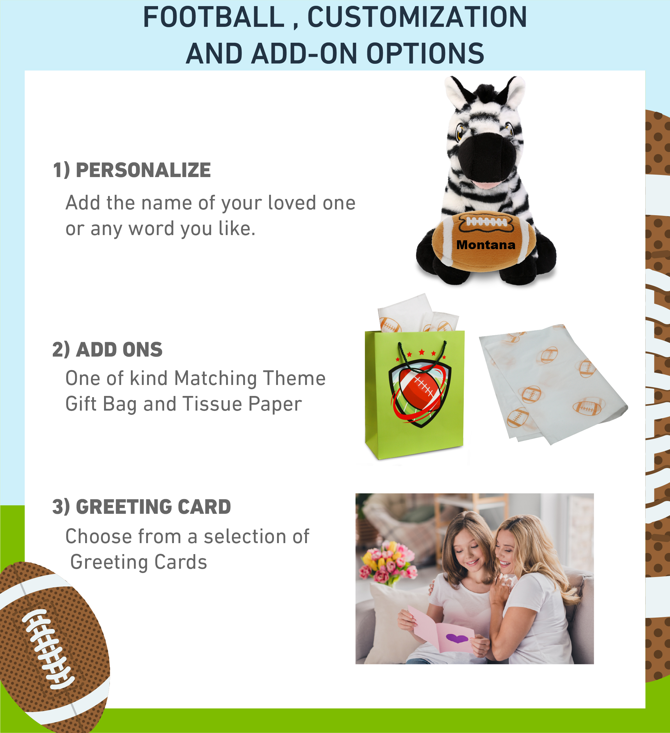 - Personalization, Customization, and Add-On Options – This Super Soft Sports Stuffed Animal Eco-Friendly Zebra Plush comes customized with a football plush. You can personalize it with the name of your loved one imprinted on the item. You also have the option to add some or all of the cool add-ons to make your gift extra special: 1) Gift Bag; 2) Tissue Paper; 3) Greeting Card.