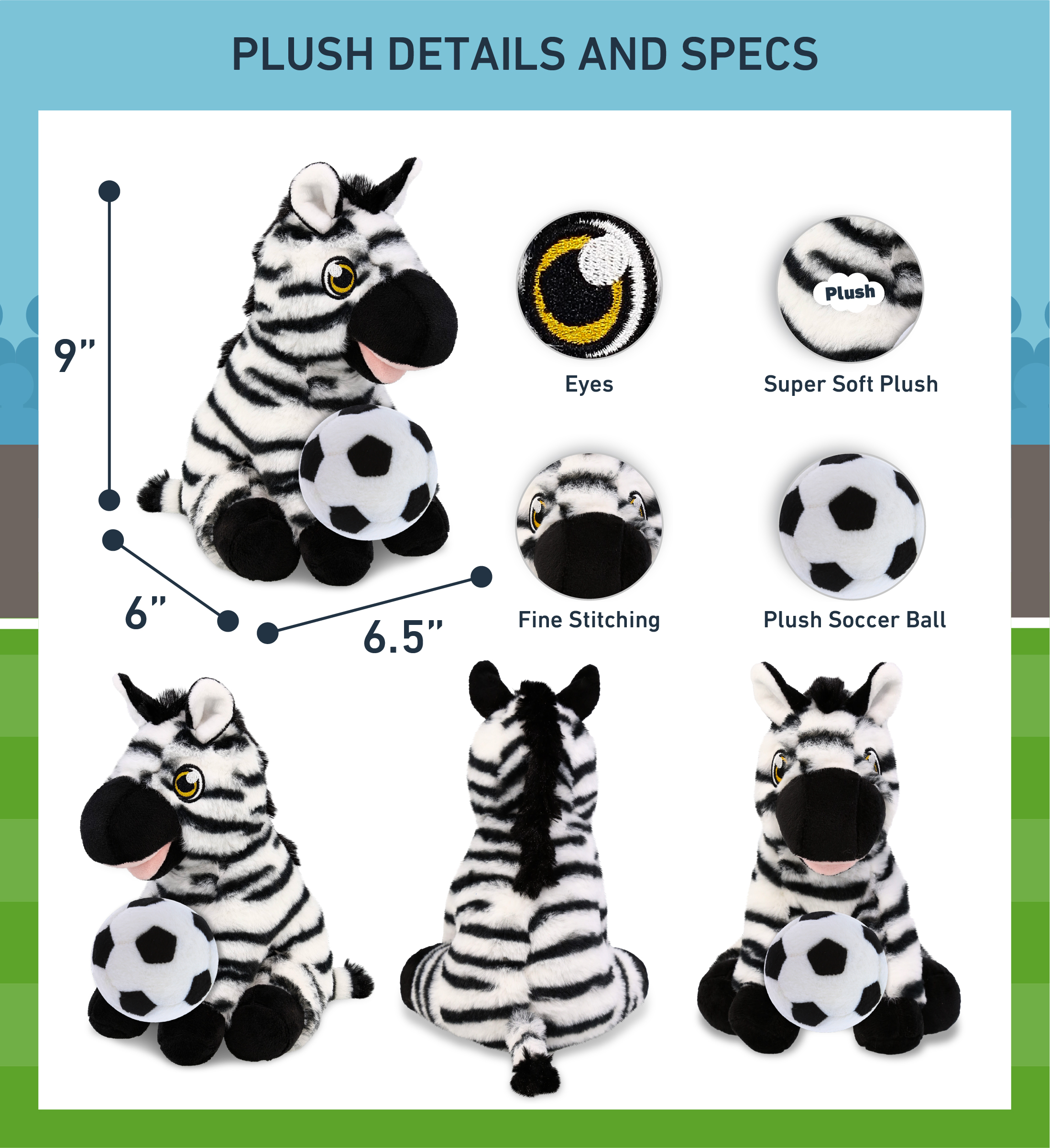 - Included with the Purchase of the Cute Zebra Plush – Includes 1 DolliBu Super Soft Zebra Eco-Friendly Plush with a soccer ball plush, decorated with realistic features. The zebra’s body with a sports gift ball plush makes the plush perfect for cuddles. The zebra plush toy features details like its black and white stripes. The zebra’s eyes make the critter so charming. The cute eco-friendly zebra plush toy buddy measures 6.5Lx6Wx9H inches.